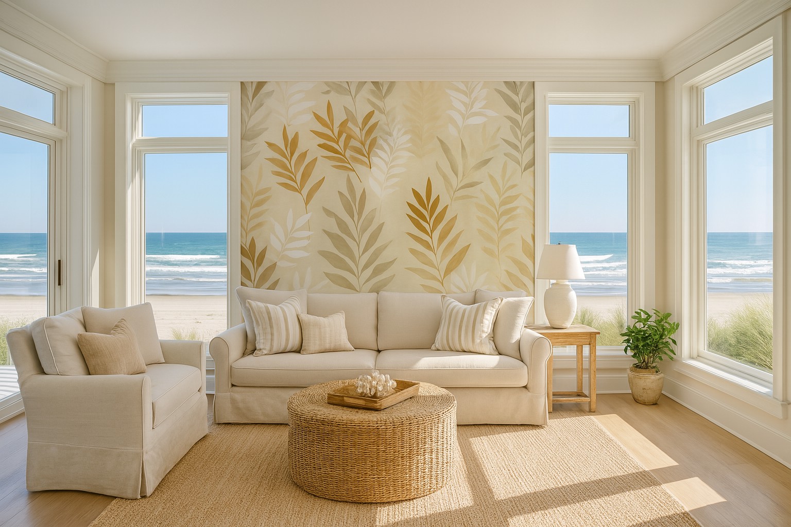This neutral botanical wallpaper features a hand-painted pattern of overlapping palm and fern leaves in soft white, beige, and ochre. The washed watercolor texture brings a subtle organic warmth to coastal bedrooms or minimalist entryways. Ideal for fans of tropical wallpaper in neutral colors, biophilic design, or Japandi wall décor.