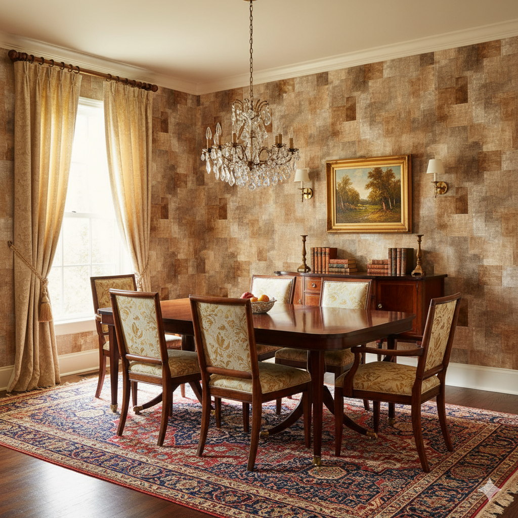 This wallpaper design features a warm, woven-textured patchwork of tawny ochres, sepias, and sand-washed browns that evoke the dry earth of desert plains. The layered tonal blocks create a depth that feels both aged and sophisticated, resembling linen fabric faded by years of sun and wind. It’s the perfect backdrop for interiors seeking warmth and grounding — ideal in a den, library, or rustic dining space. Pair it with natural wood tones, leather seating, and warm ambient lighting to bring out its earthy richness. Its tactile illusion makes walls appear subtly textured, giving modern apartments, farmhouse kitchens, or boutique hotels a sense of handcrafted authenticity.