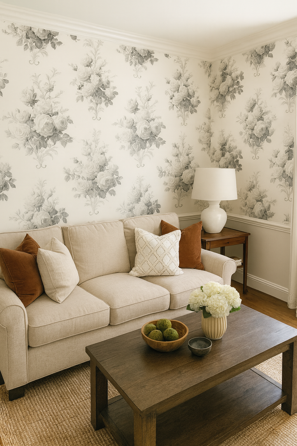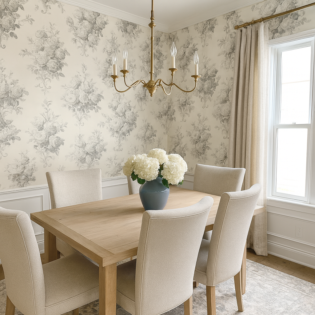 Clusters of painterly roses in soft sepia tones curl across an ivory background in Sepia Bloom. The petals are shaded with care, offering a romantic vintage elegance. This design suits a Parisian powder room, antique-inspired bedroom, or chic boutique looking for something soft, sweet, and timeless.