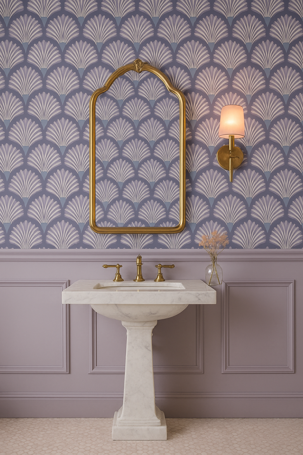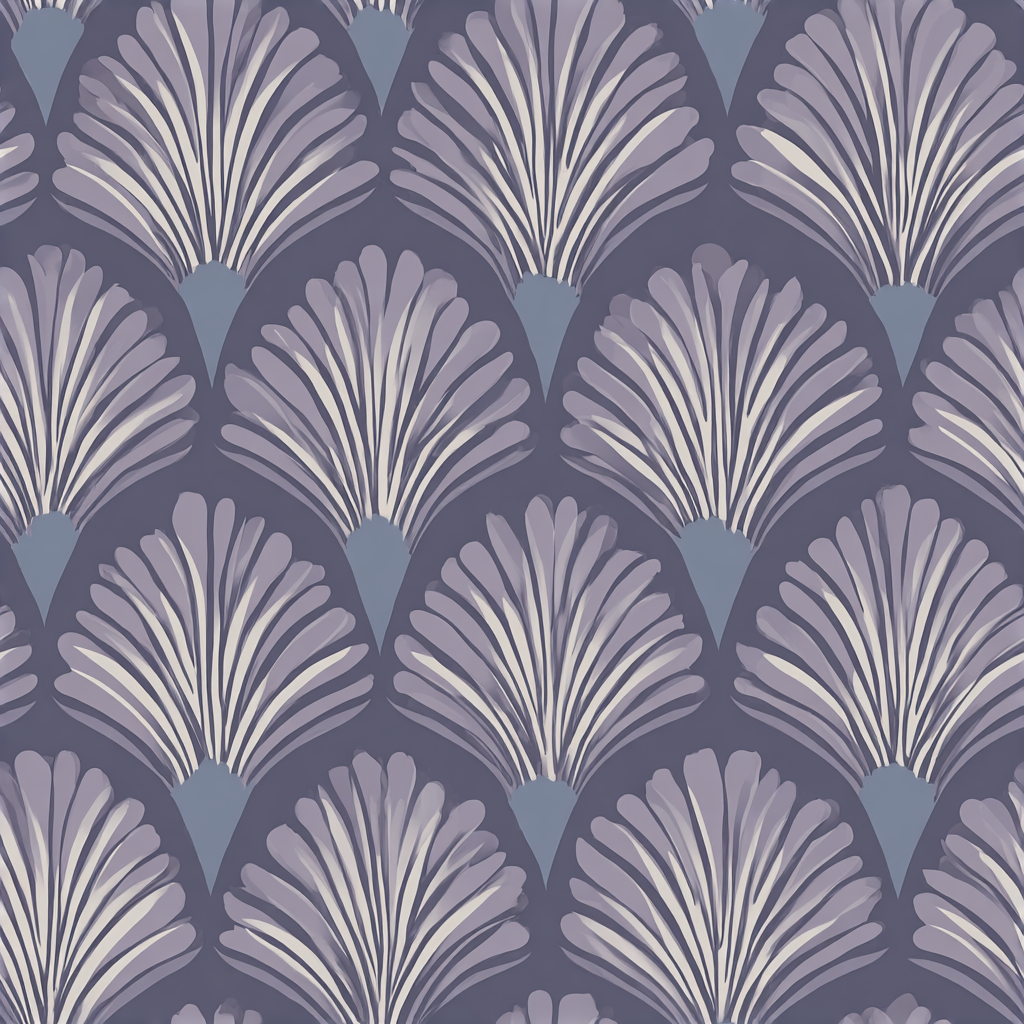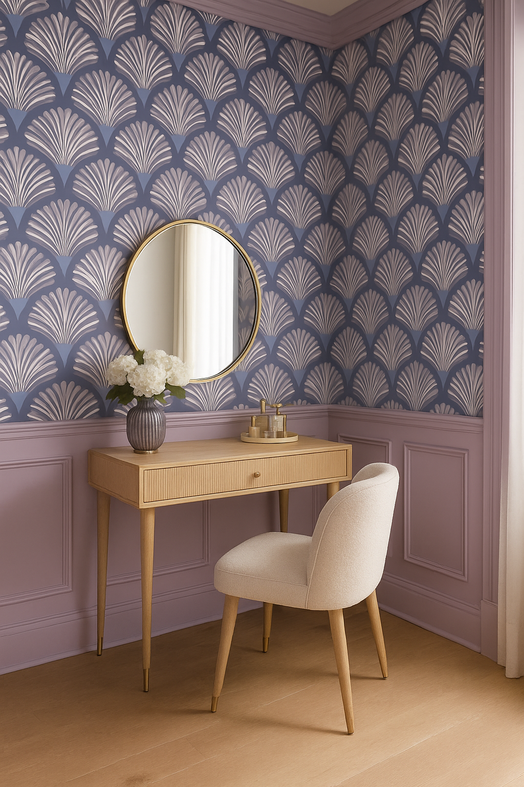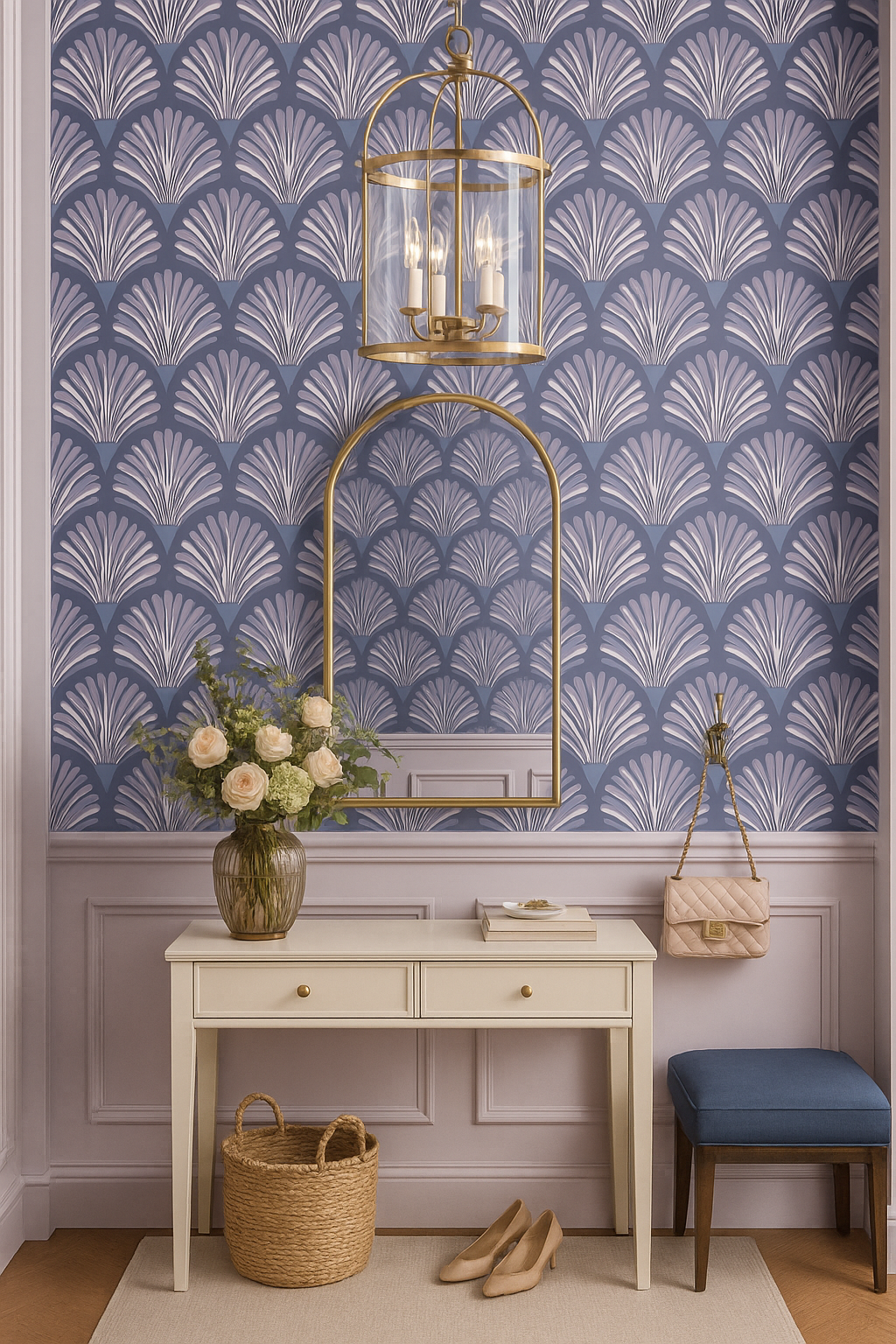 A Deco-inspired delight, Shellscape features repeating fan-shaped motifs that resemble seashells, palms, or artful sunbursts depending on how you view them. Done in soft lavenders, slate blues, and muted lilac on a dusty purple background, it has the rhythm of old-school wallpaper with a contemporary twist. A perfect fit for powder rooms, guest bedrooms, or dressing spaces that lean artful and feminine.