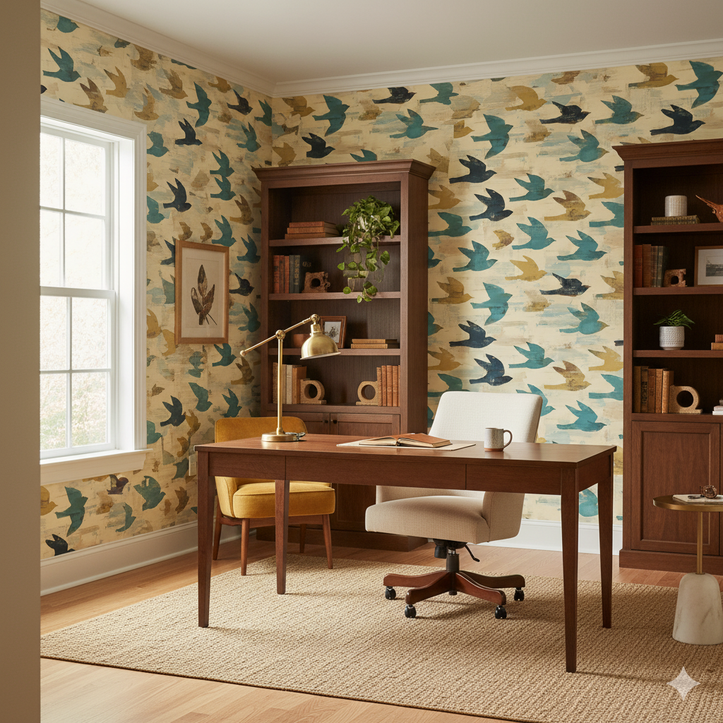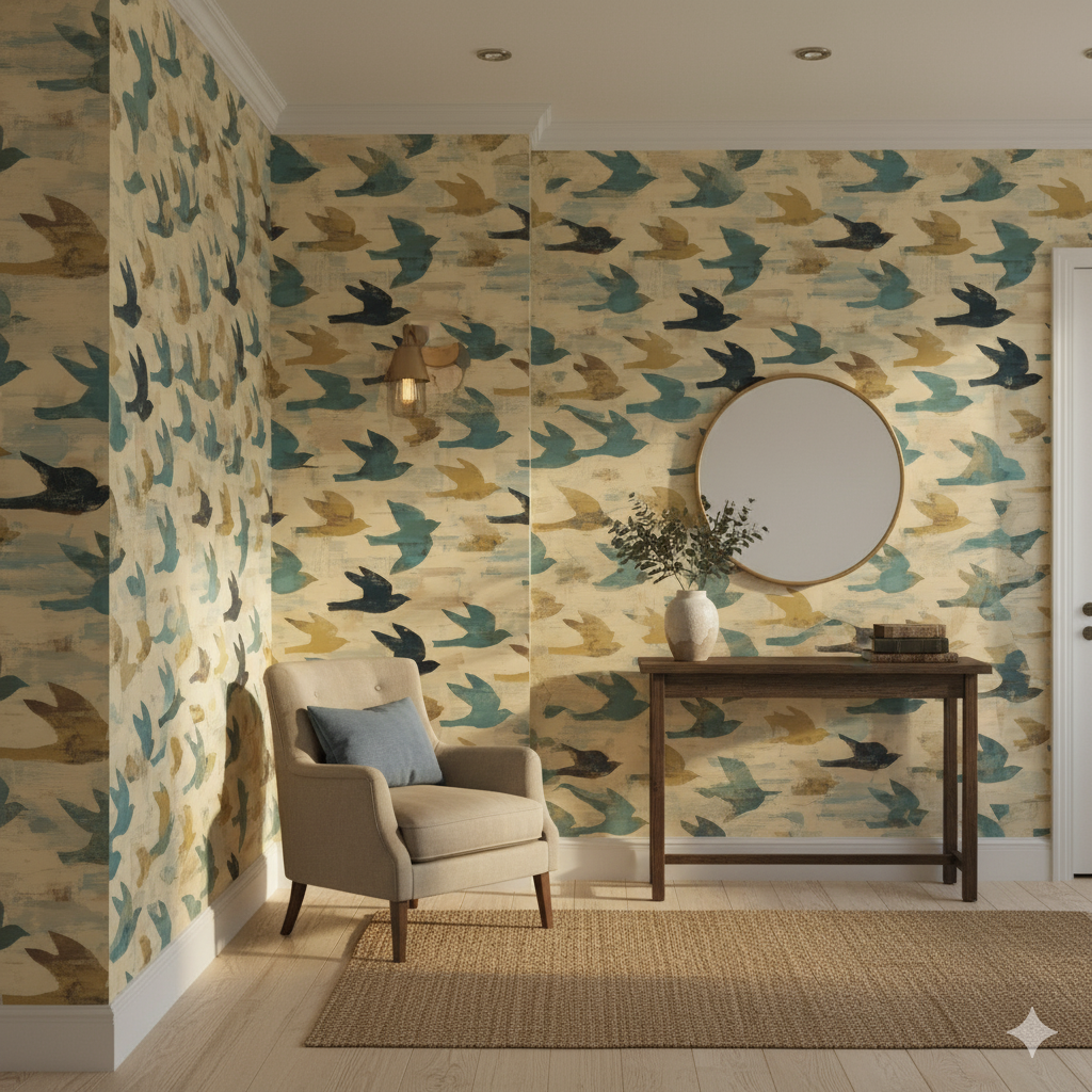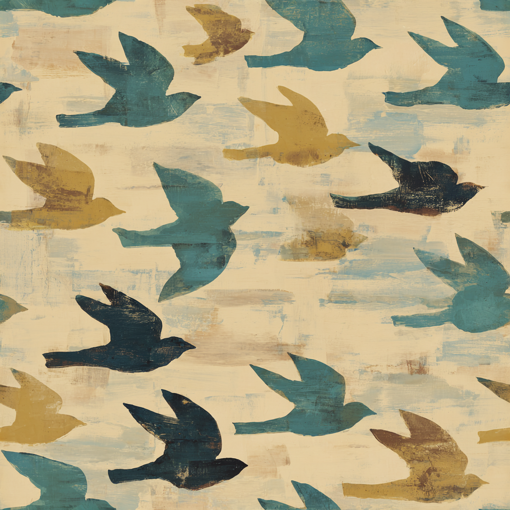 Simplified silhouettes of birds soar across a pale ochre backdrop streaked with soft blue and muted gold. The composition captures the freedom and movement of migration, rendered with the flat, symbolic power of primitivist forms. The birds appear mid-motion, wings outstretched, suggesting journeys, transitions, and the vitality of nature. This wallpaper works beautifully in sunrooms, children’s play spaces, or airy living rooms where light can enhance its buoyant spirit. Paired with natural linens, wicker, and warm woods, it creates a relaxed and uplifting environment.