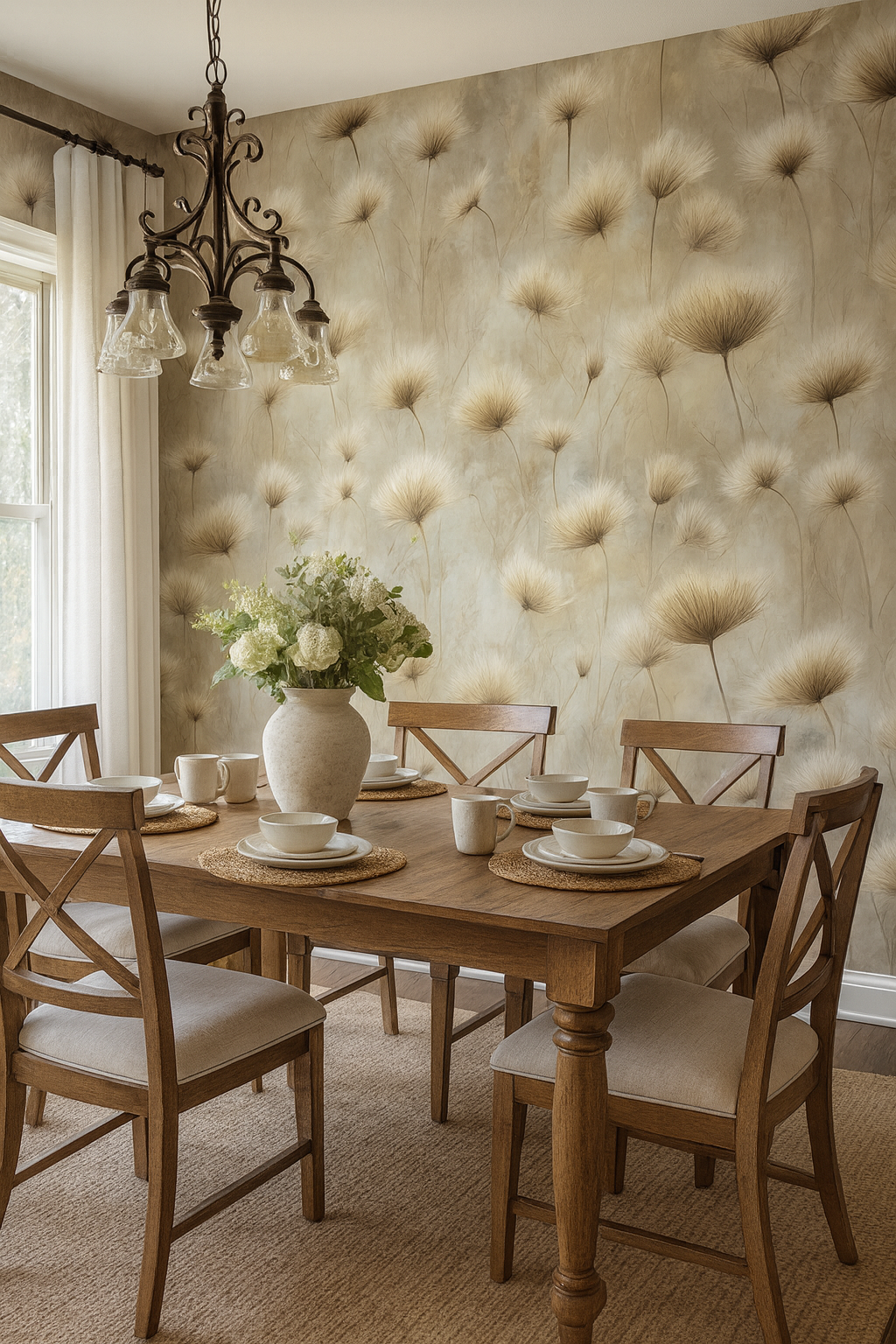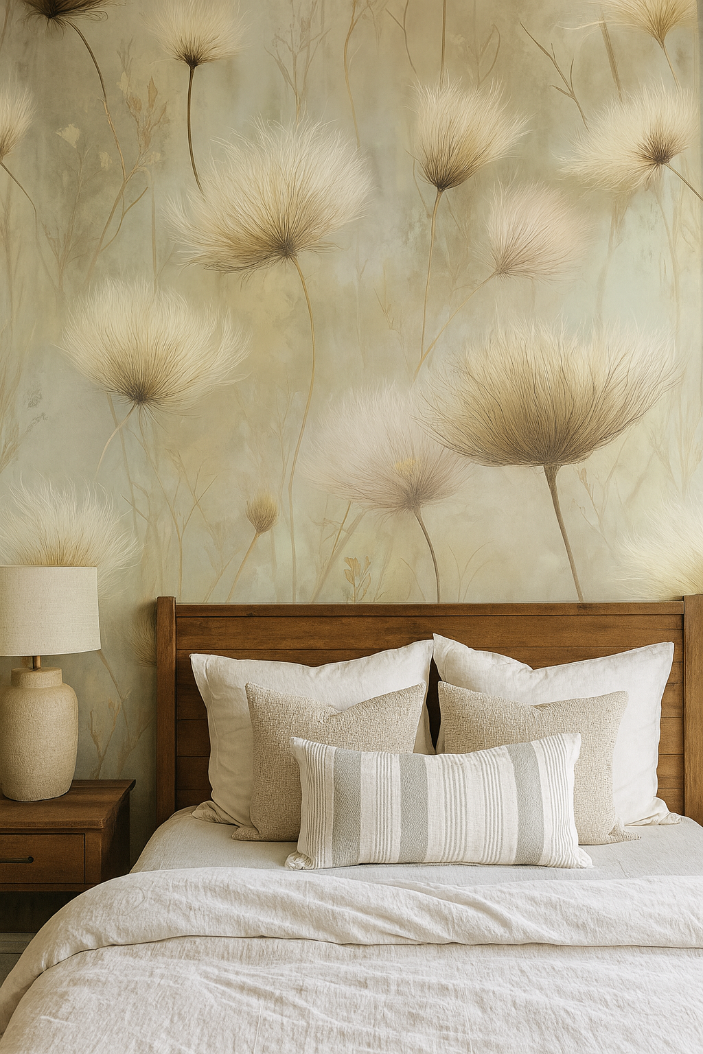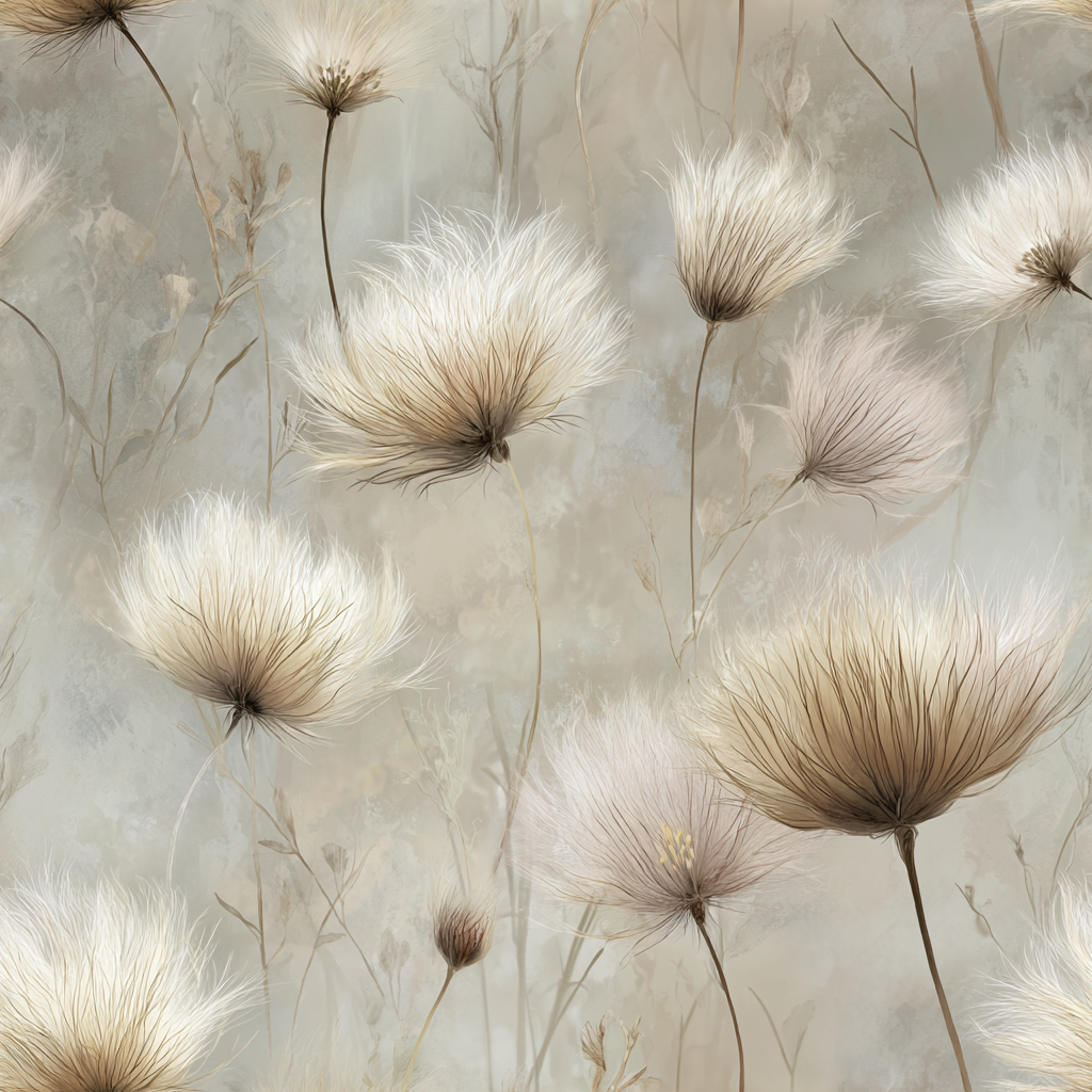 “Smoke Bloom Drift” showcases the unique feathery forms of Prairie Smoke flowers in a soft, blurred watercolor aesthetic. These whimsical blooms, in shades of ivory, blush, and sand, float against a misty gray-beige backdrop. Subtle stems and ghostlike foliage add dimension and serenity. Perfect for Scandinavian-inspired interiors, baby nurseries, or dreamy boudoirs, this wallpaper delivers softness with artistic flair.