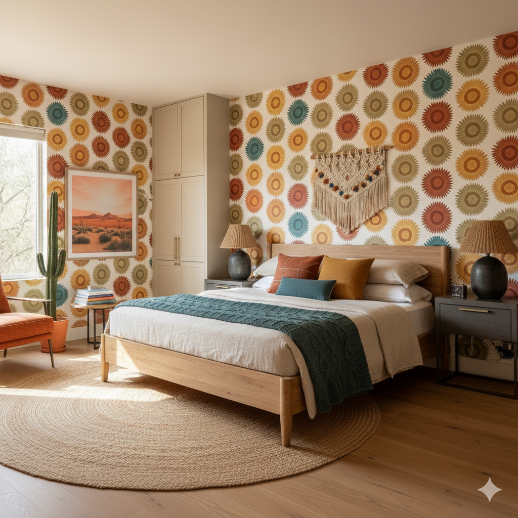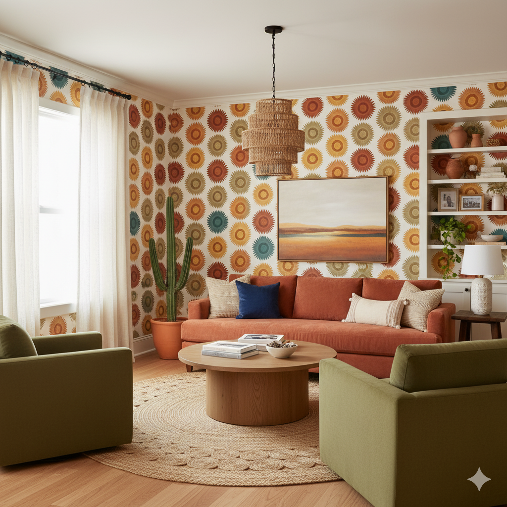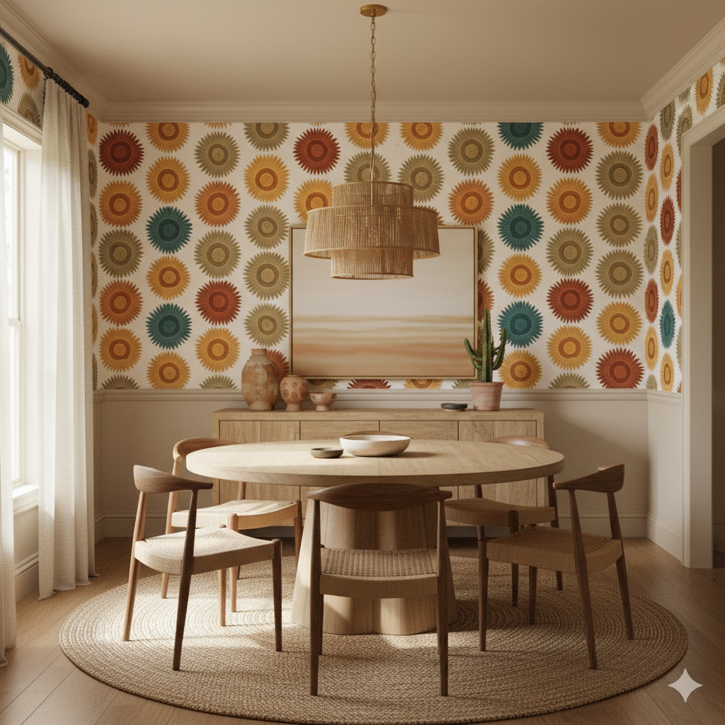 Inspired by pre-Columbian motifs, Sol de Cusco radiates energy through repeating sunburst medallions in earthen and jewel tones — ochre, turquoise, and rust. The design feels both geometric and organic, echoing woven textiles and ancient carvings. Its symmetry offers structure, while the tonal variation adds warmth and artistry. This wallpaper transforms walls into cultural narratives — ideal for boho-chic interiors, southwestern aesthetics, or artisan-inspired spaces. Paired with pottery, woven rugs, and brass details, it creates a sense of heritage and sophistication.