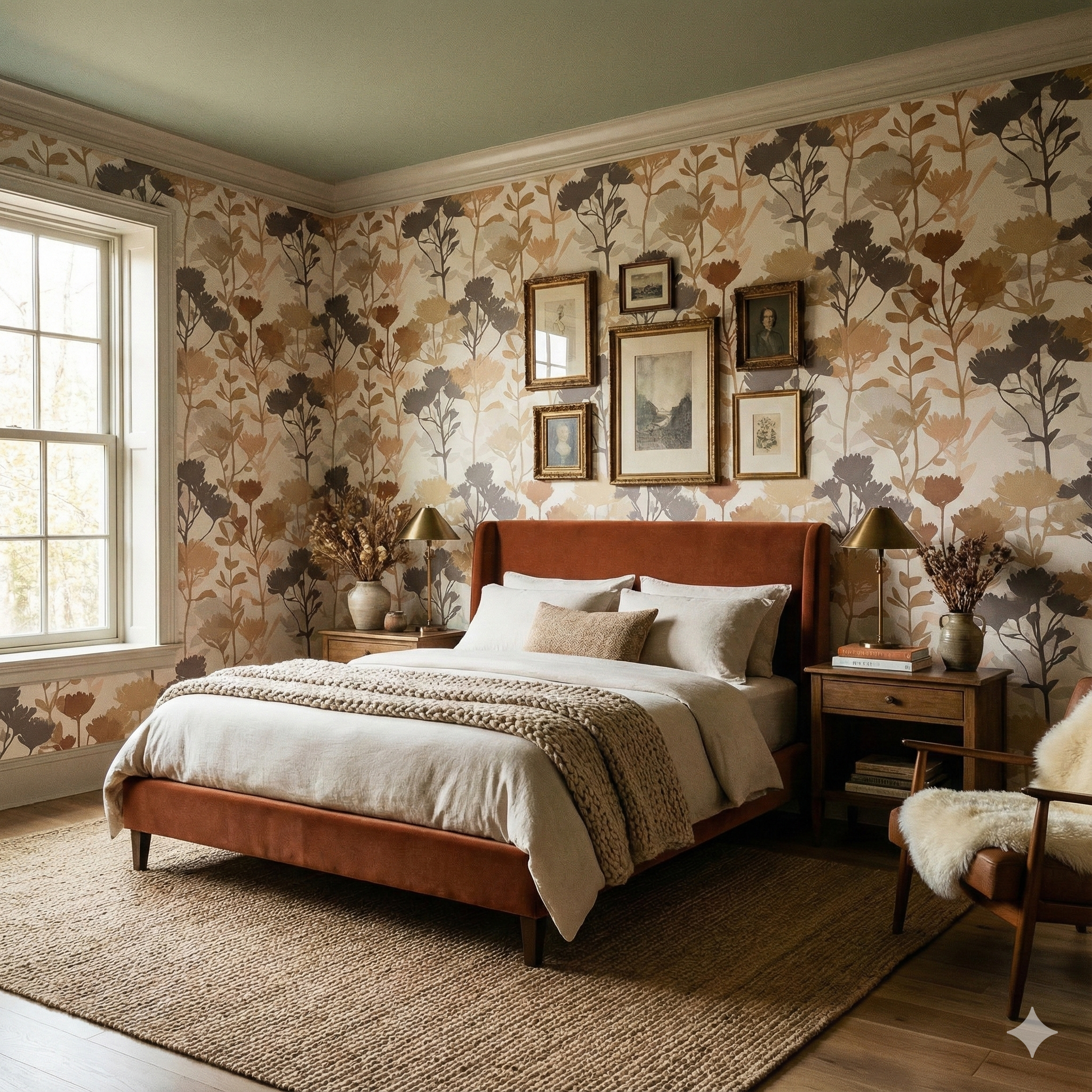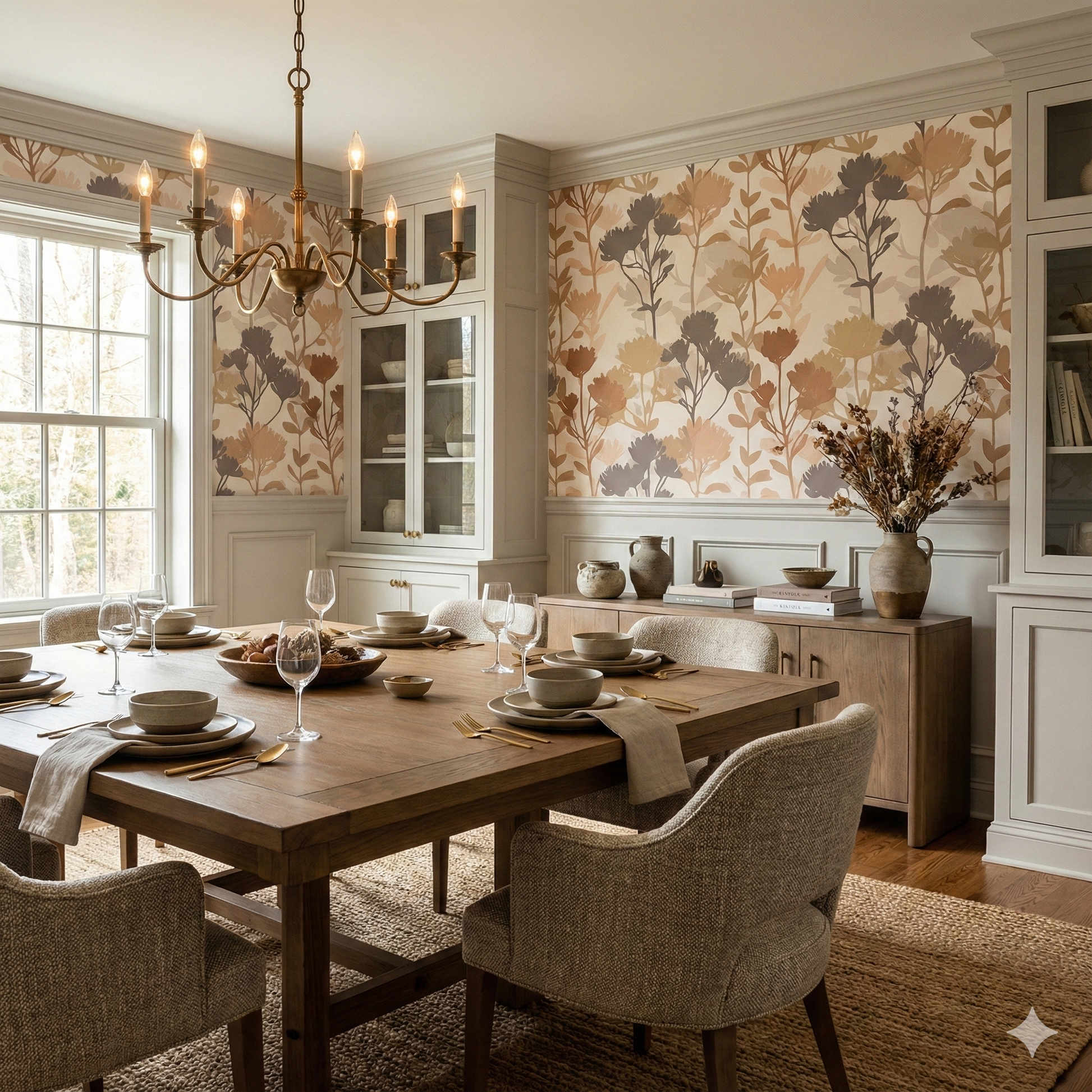 Solera Meadowveil captures the softness of dried florals painted in warm, dusty hues—ginger, clay, taupe, mineral gray, and muted ochre. Layers of semi-transparent blooms overlap in gentle washes, creating depth without heaviness, like a meadow viewed through late-afternoon light. The minimalist stems and petals blend into an off-white ground that keeps the pattern bright yet grounded. This wallpaper feels warm, organic, and nostalgic, perfect for farmhouse dining rooms, airy California-casual living spaces, sunlit kitchens, cozy guest rooms, or nurseries wanting neutral florals without leaning feminine. Solera Meadowveil pairs beautifully with light oak, terracotta tile, woven textures, linen upholstery, and vintage botanicals to create a relaxed but refined interior.