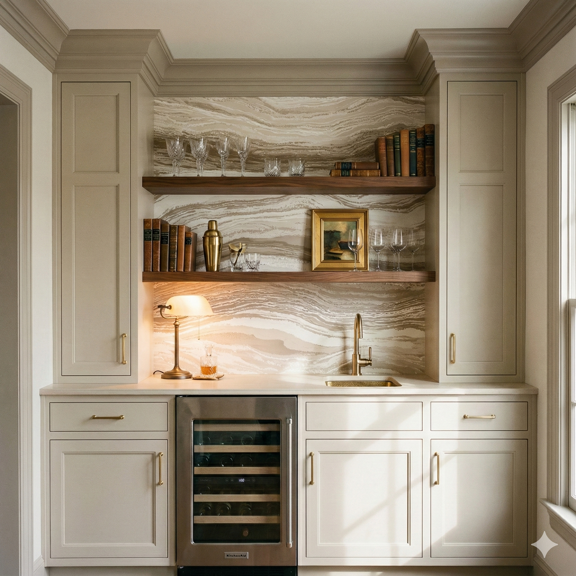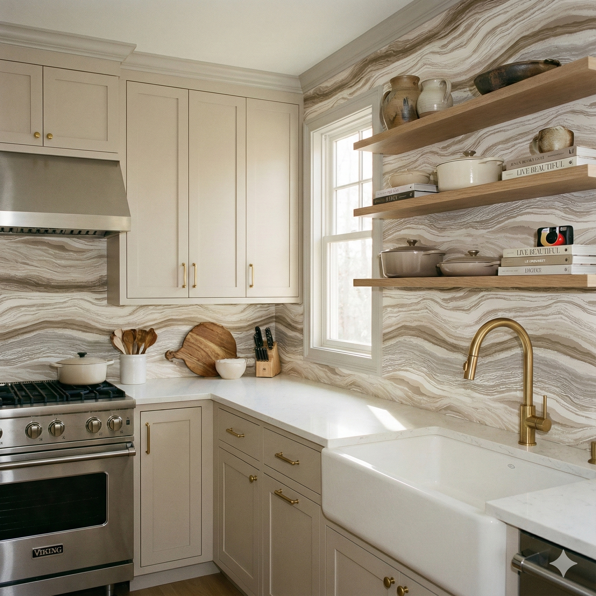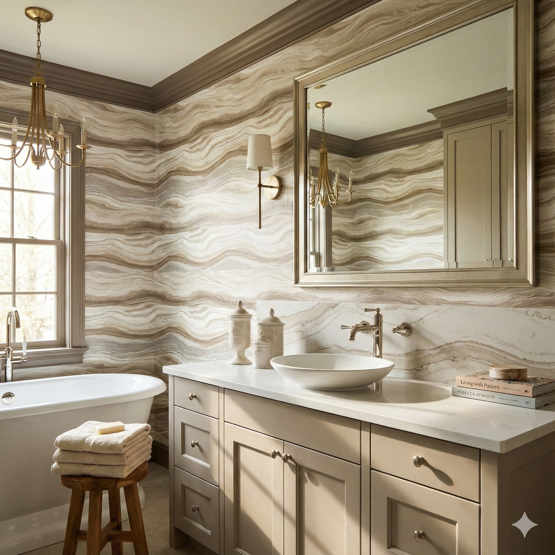 Stoneveil Strata evokes the soft erosion of sedimentary stone, painted as wide, horizontal layers of cream, taupe, clay, and muted gray. Each band is textured with subtle tonal shifts and painterly detailing, giving the effect of natural mineral veining softened by time and water. The look is warm, grounded, and luxurious—never literal, always atmospheric. This is a perfect pattern for modern organic interiors, spa-like bathrooms, Mediterranean-inspired dining rooms, or any space craving natural texture without leaning into bold geometrics. Stoneveil Strata works beautifully with limestone tile, travertine, plaster walls, leather accents, and warm metallics like champagne bronze or brushed gold. It feels effortlessly expensive.