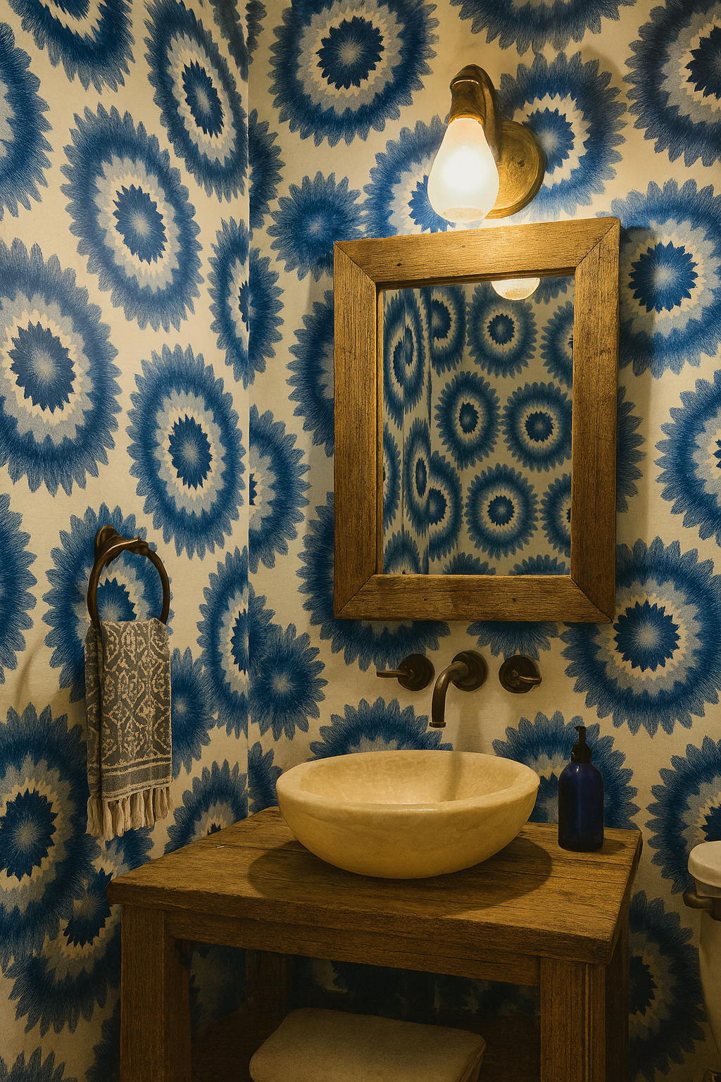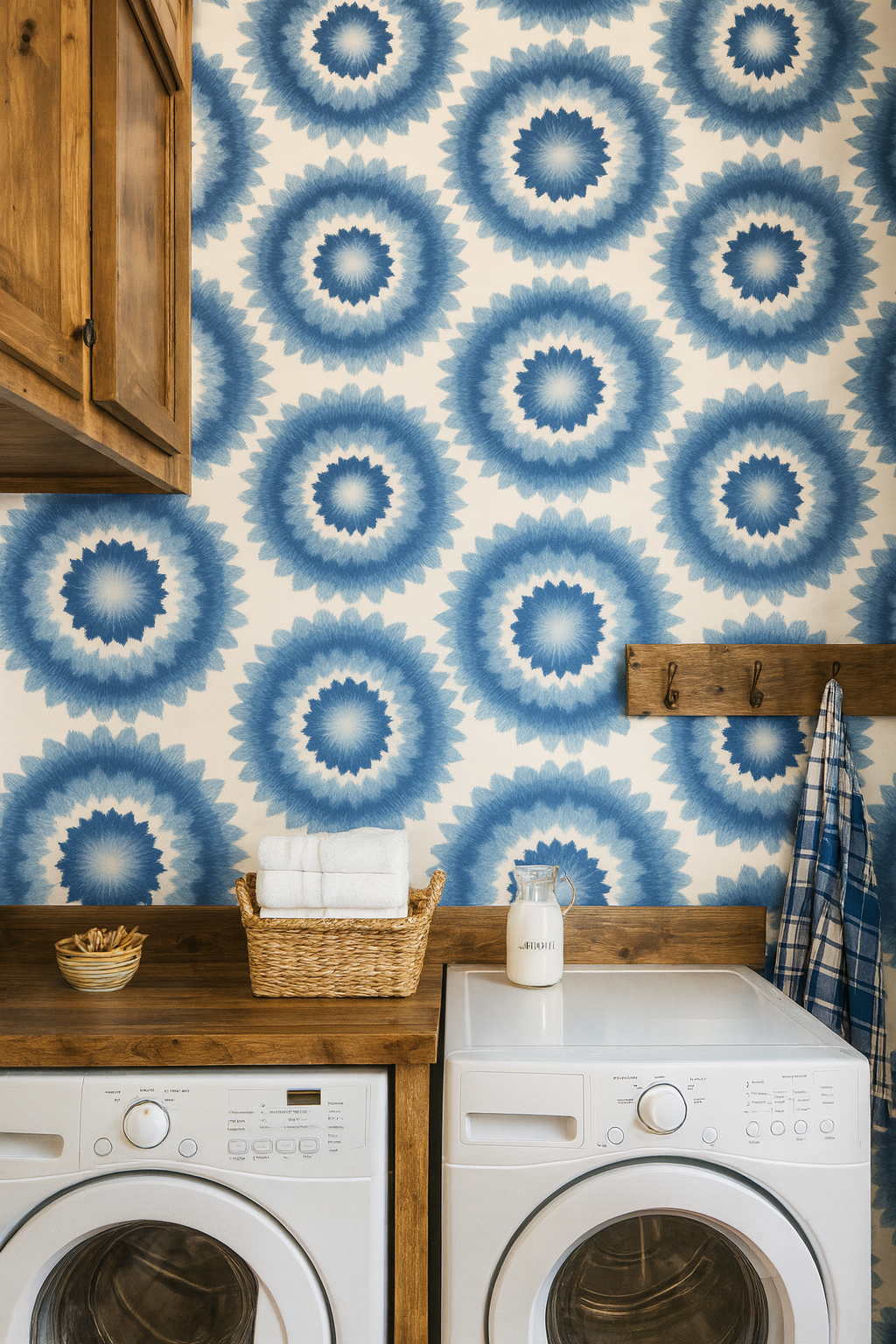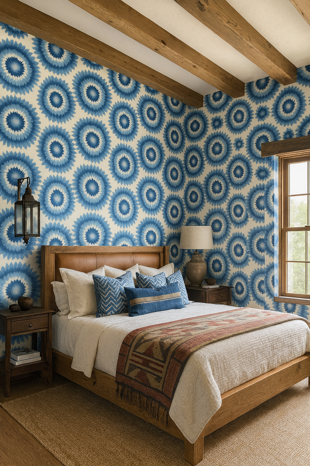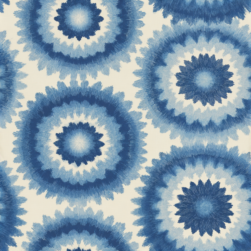 A mandala-meets-shibori design featuring large concentric bursts radiating from creamy centers into indigo halos. “Sunburst Echo” merges meditative symmetry with textile artistry, ideal for meditation rooms, eclectic bedrooms, or feature walls that need a spiritual pulse.