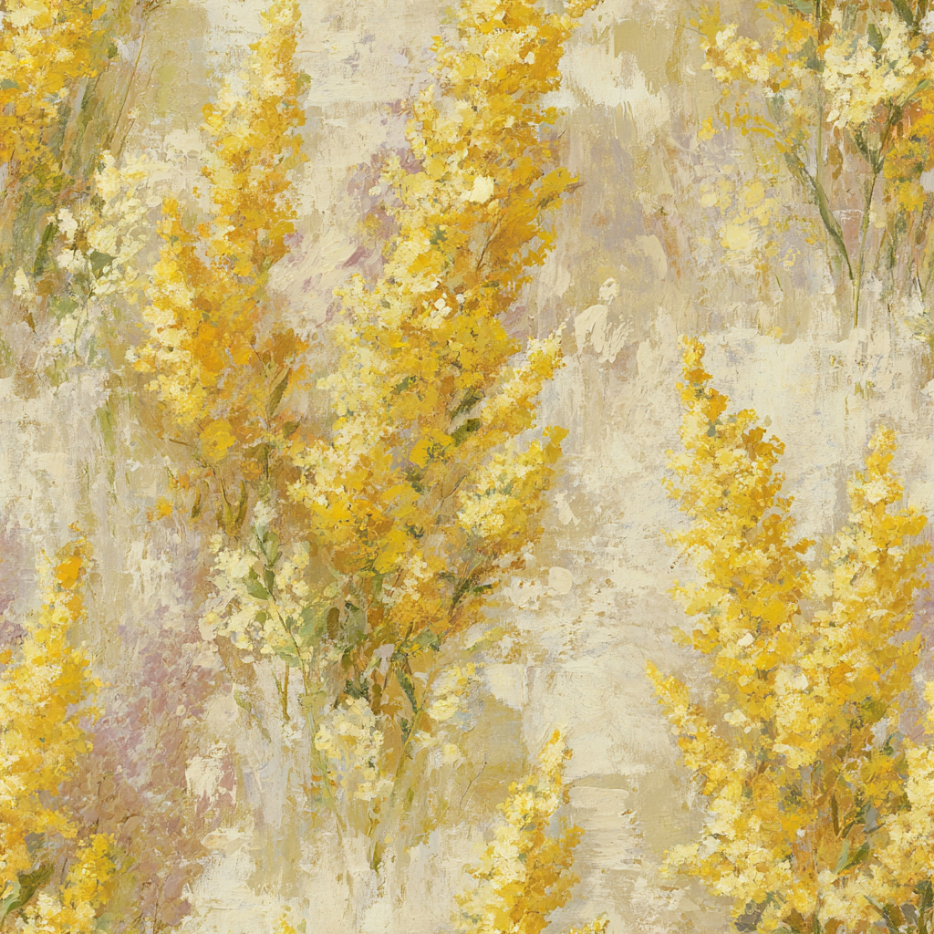 "Sunflare Meadow" is a golden celebration of nature, featuring blooming goldenrod clusters rendered in painterly strokes of yellow, cream, and soft lavender undertones. Its warm neutral backdrop makes it a stunning choice for warm-toned interiors, country kitchens, and vintage-inspired parlors craving a burst of sunshine.