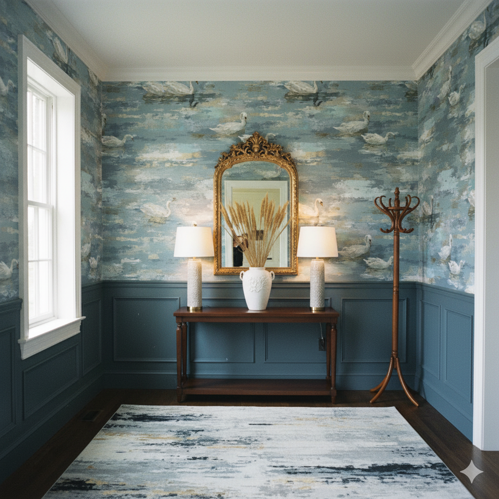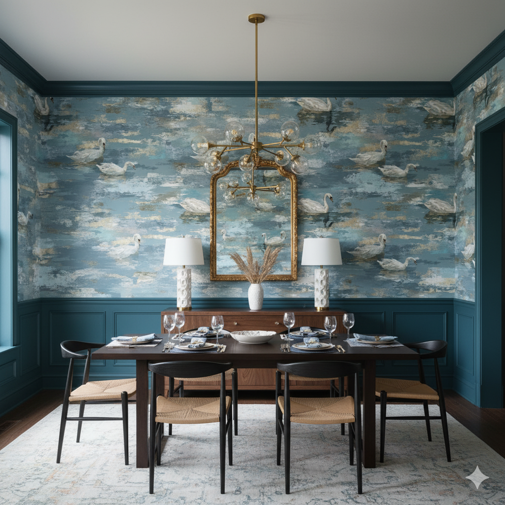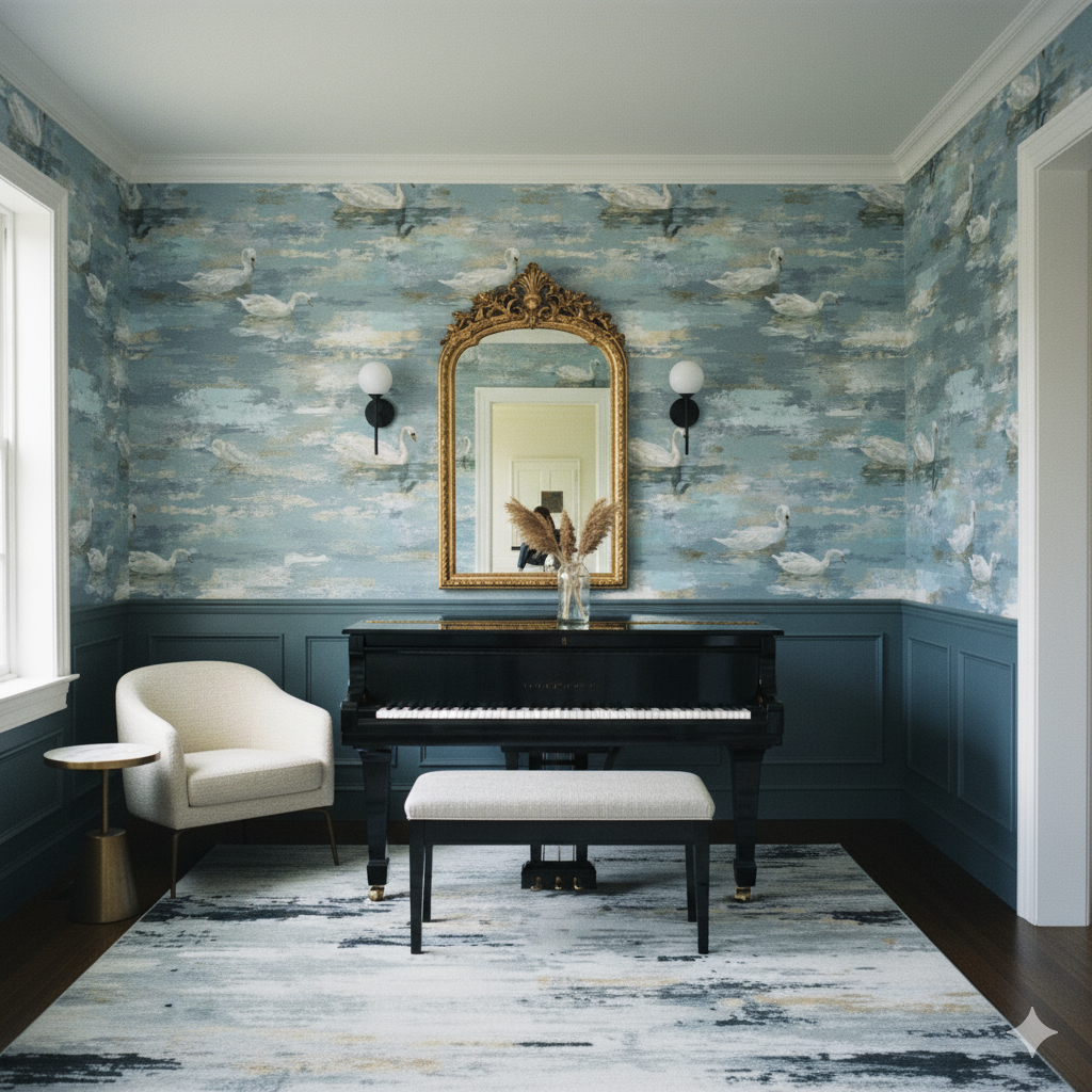 Serene and painterly, Swanmere captures the dreamlike stillness of water at dusk. Pale swans glide across a misty expanse of blue-gray, their reflections softly diffused among abstract strokes of gold and ivory. The texture feels like oil paint brushed across linen — expressive yet tranquil. Perfect for bedrooms, bathrooms, or lakeside homes, Swanmere brings an impressionist calm to interiors. It pairs beautifully with natural stone, brushed brass, or soft blue-gray upholstery, inviting the elegance of still water into everyday life.