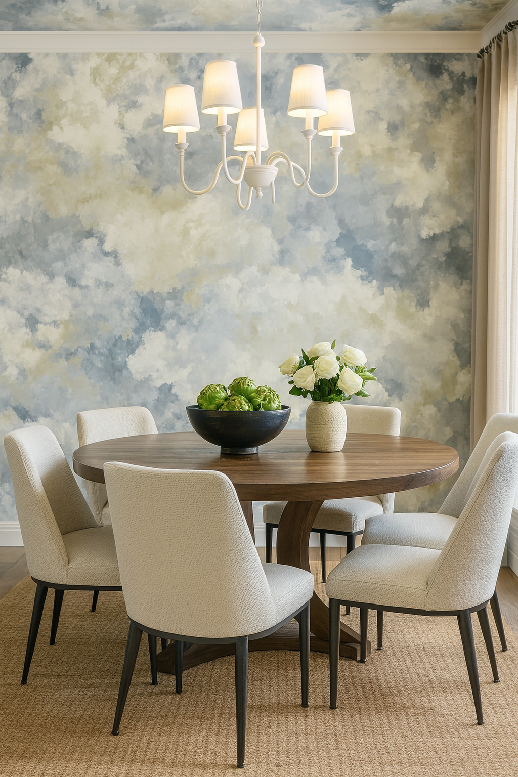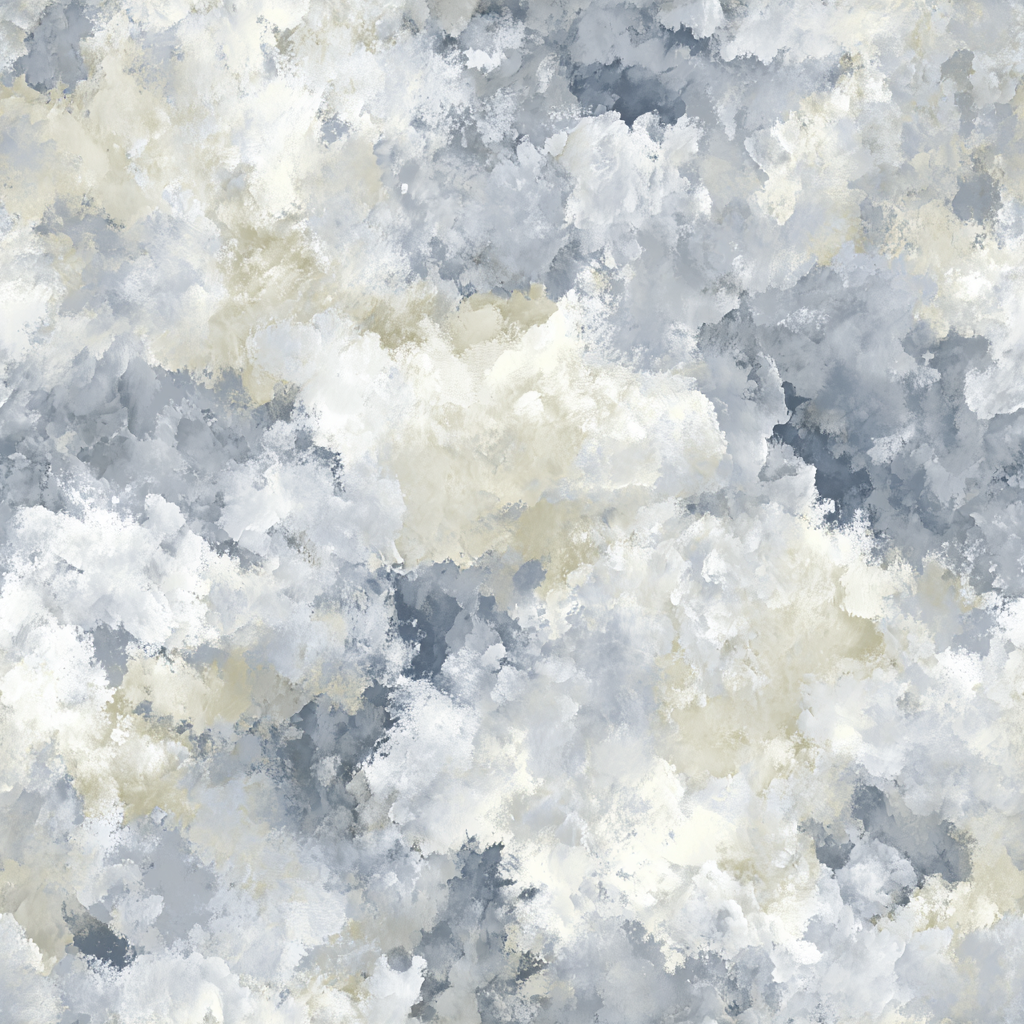 A beautifully chaotic blend of cloudy brushstrokes, this pattern evokes the mood of a windswept sky at twilight—where fog, mist, and light mingle in a fluid abstraction. Pale greys, stormy blues, and ghostly ivories are dabbed in spontaneous, cloud-like textures, resembling the fleeting drama of a sky just before rain.