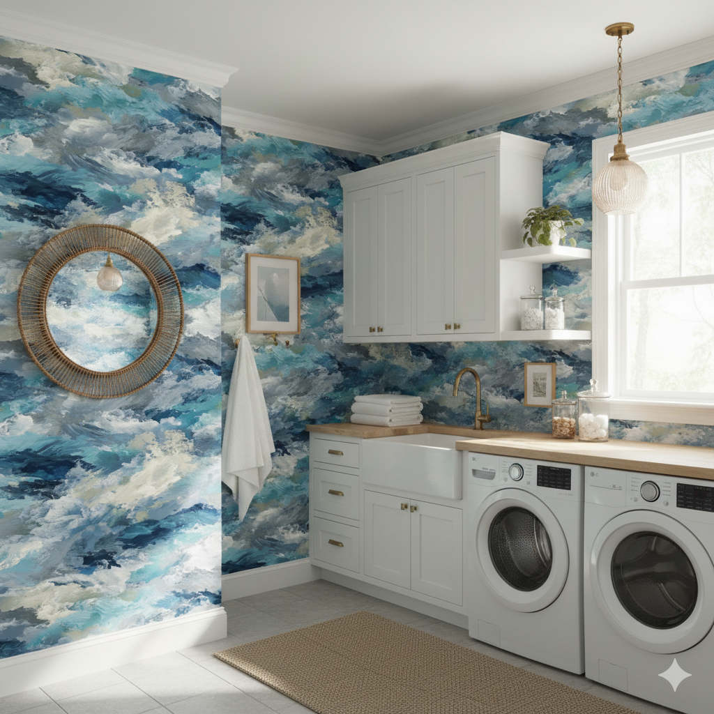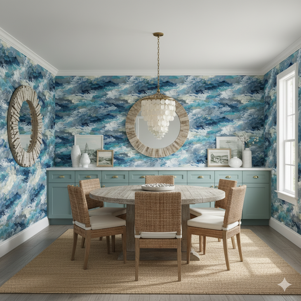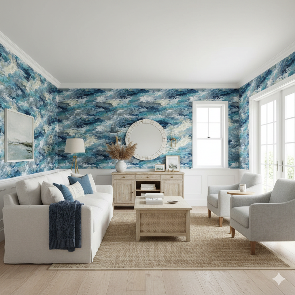 Tempestine captures the electricity and motion of a seascape caught between calm and chaos. With painterly swirls of deep indigo, cloud gray, soft ivory, and turquoise, the design evokes crashing waves and shifting skies. Every brushstroke feels alive, giving the illusion of light breaking through storm clouds. The composition’s layered texture creates depth that transforms walls into art—perfect for coastal homes, contemporary spaces, or any interior that craves the raw beauty of nature’s volatility. In a living room, it adds drama; in a bedroom, it becomes meditative, reflecting the push and pull of ocean air and weathered cliffs. Paired with driftwood tones, brass accents, or natural linen, Tempestine turns a wall into an atmospheric masterpiece that balances power with serenity.