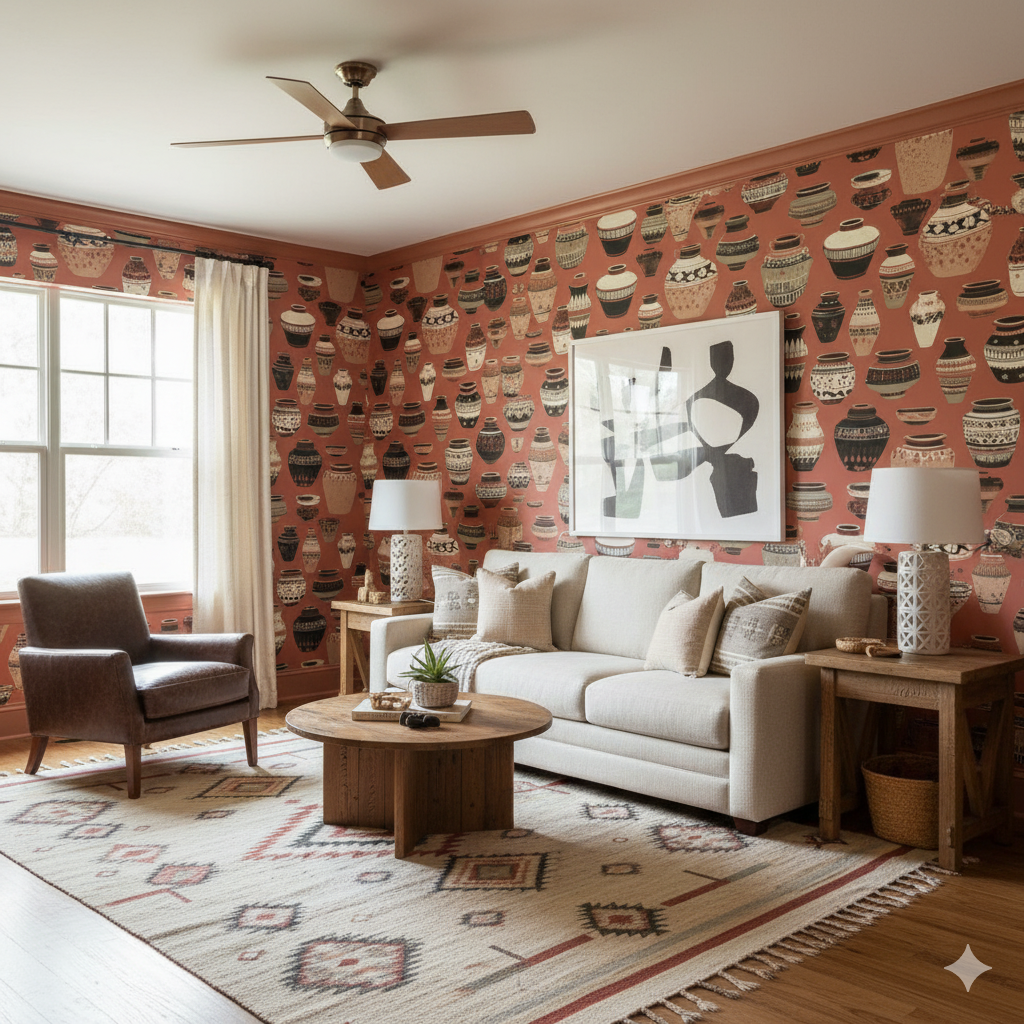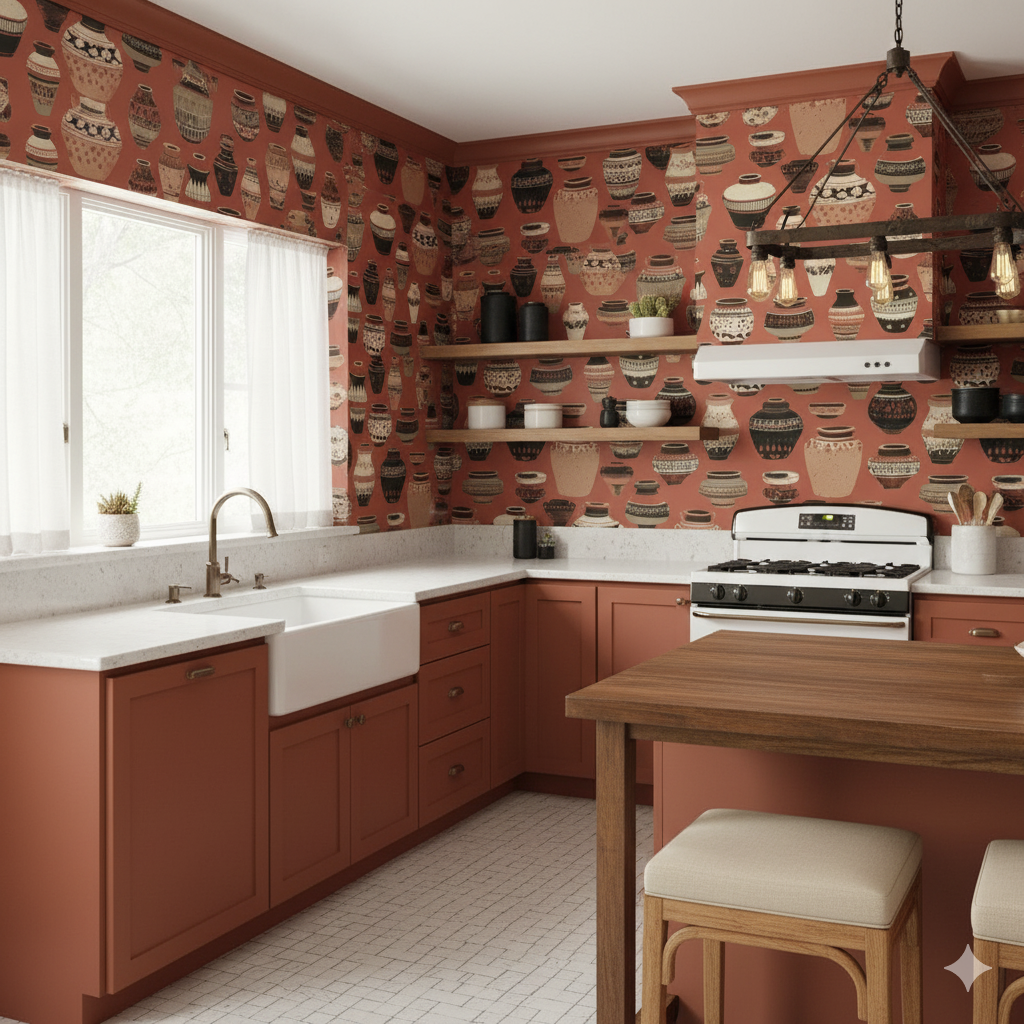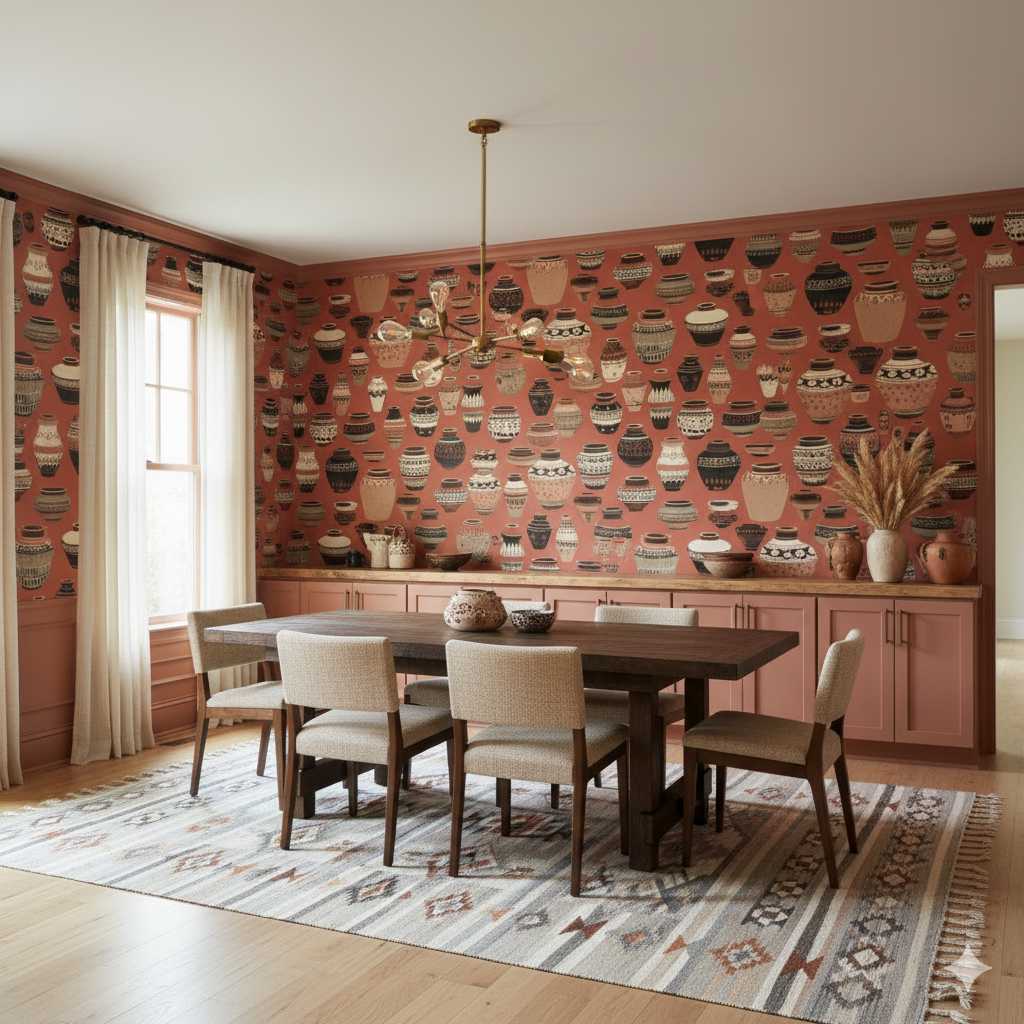 A curated display of culture and craftsmanship, Terra Museo pays homage to ancient pottery and the artisans who shaped it. Rows of hand-painted vases in clay, umber, and sand float against a warm terracotta ground, evoking museum displays and sun-baked markets. The composition feels collected — each vessel distinct, yet unified in tone and spirit. This design thrives in eclectic homes, desert-inspired interiors, or dining spaces that celebrate texture and history. Paired with plaster walls, linen, and woven textiles, it exudes authenticity and timeless warmth.