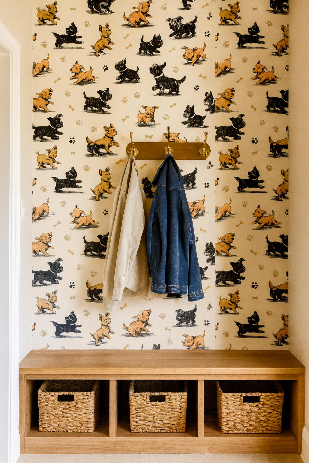 Lively terriers, dachshunds, and playful pups dash and prance in a vintage sketch style across this animated print. Rendered in black, tan, dusty gray, and soft rust on a bone-colored background, these stylized dogs are punctuated by paw prints and scattered bones. A charming choice for pet boutiques, mudrooms, laundry spaces, or any dog-lover’s den.