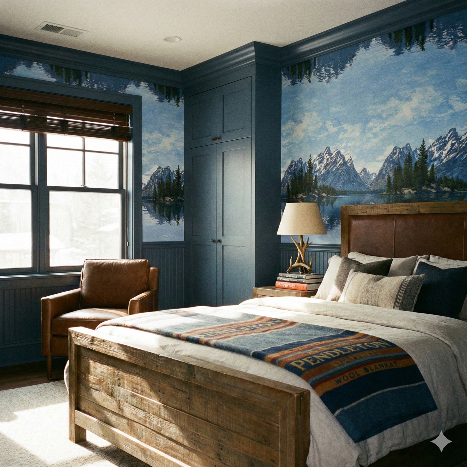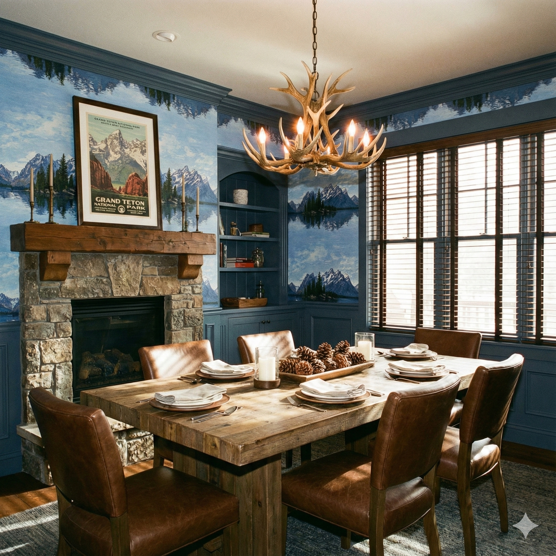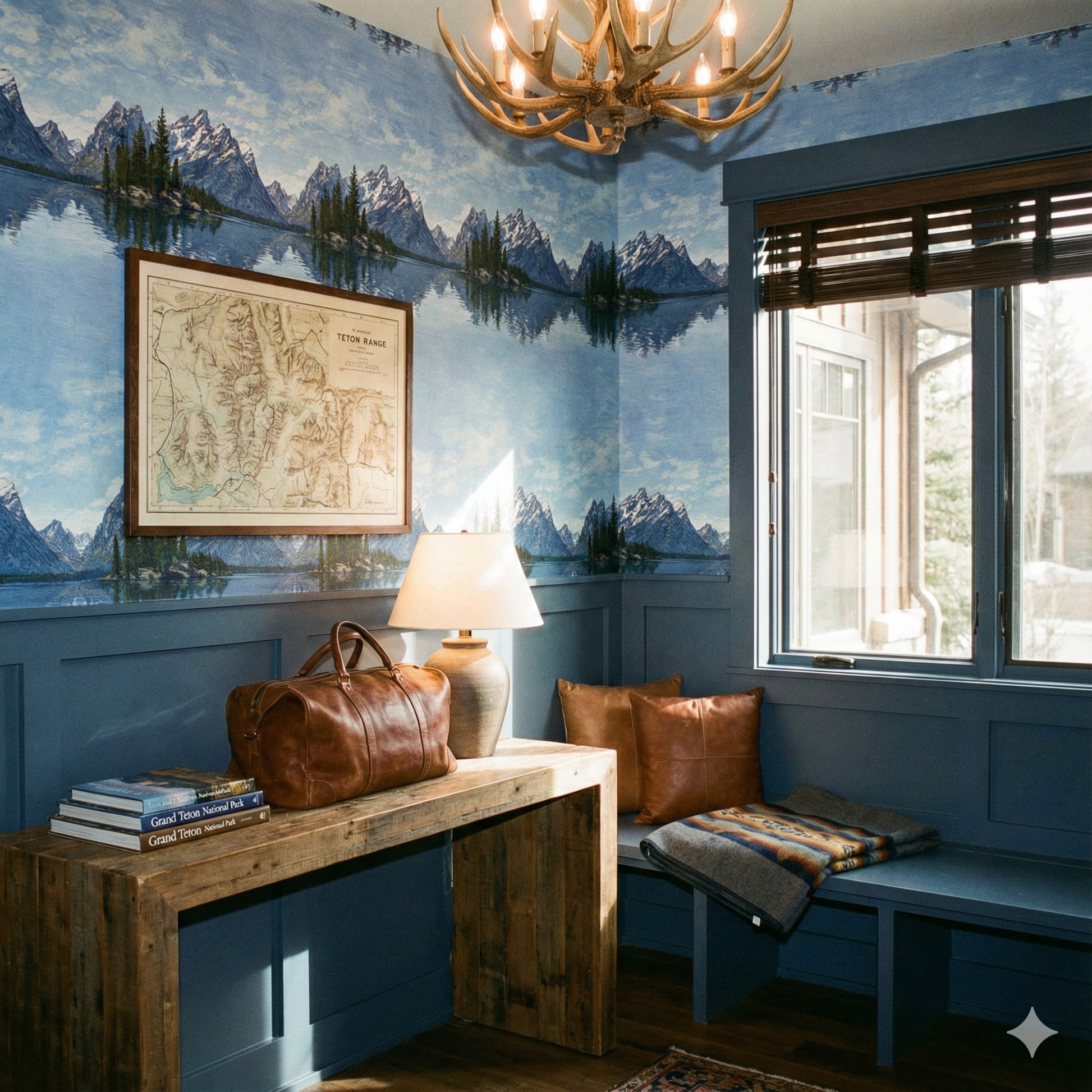 Cool, crystalline, and serene, this design captures the grandeur of Wyoming’s Teton Range mirrored in still alpine water. Hand-rendered linework and delicate shading lend an engraved, vintage-map quality, while the palette—icy blues, silvers, and pine greens—feels crisp and timeless. The symmetry of reflection creates balance and calm, ideal for bedrooms, studies, or lakeside retreats. “Teton Reflection” brings the clarity of mountain air and the elegance of classical artistry into interior form, echoing the quiet dignity of wilderness preserved in ink.