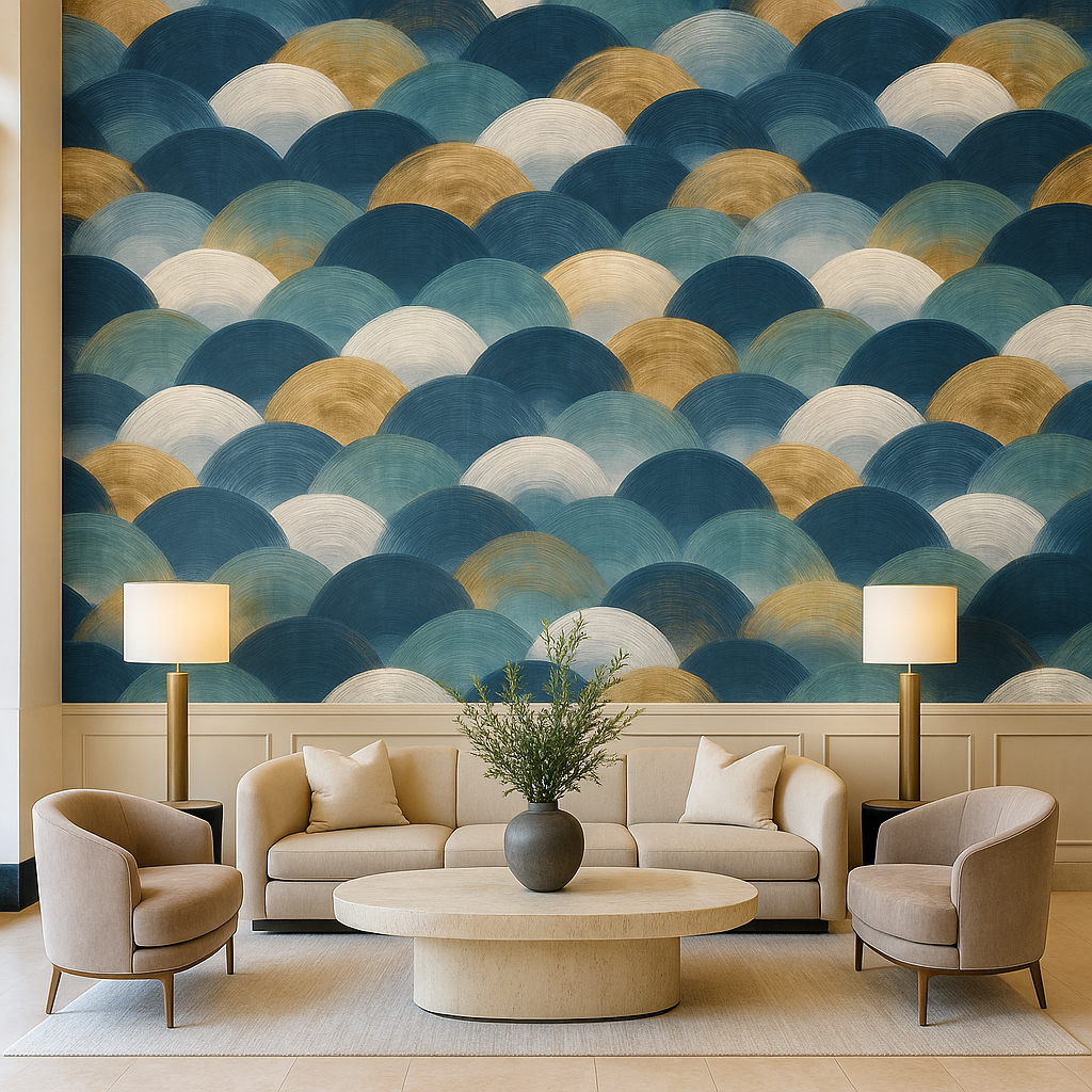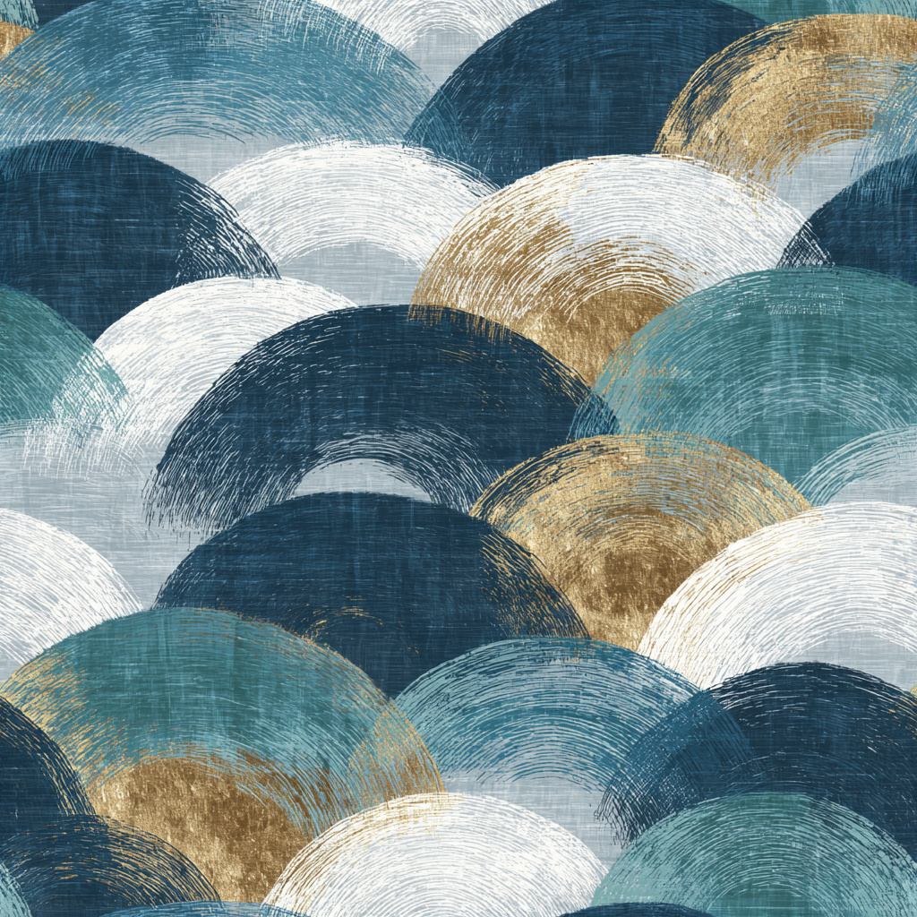 A stylized interpretation of rolling ocean waves, this pattern uses broad, overlapping semicircular brushstrokes to mimic both Japanese seigaiha motifs and the energy of abstract expressionism. With a color palette of deep navy, weathered teal, warm ochre, and white chalk, the arcs pulse like a tide drawing breath.