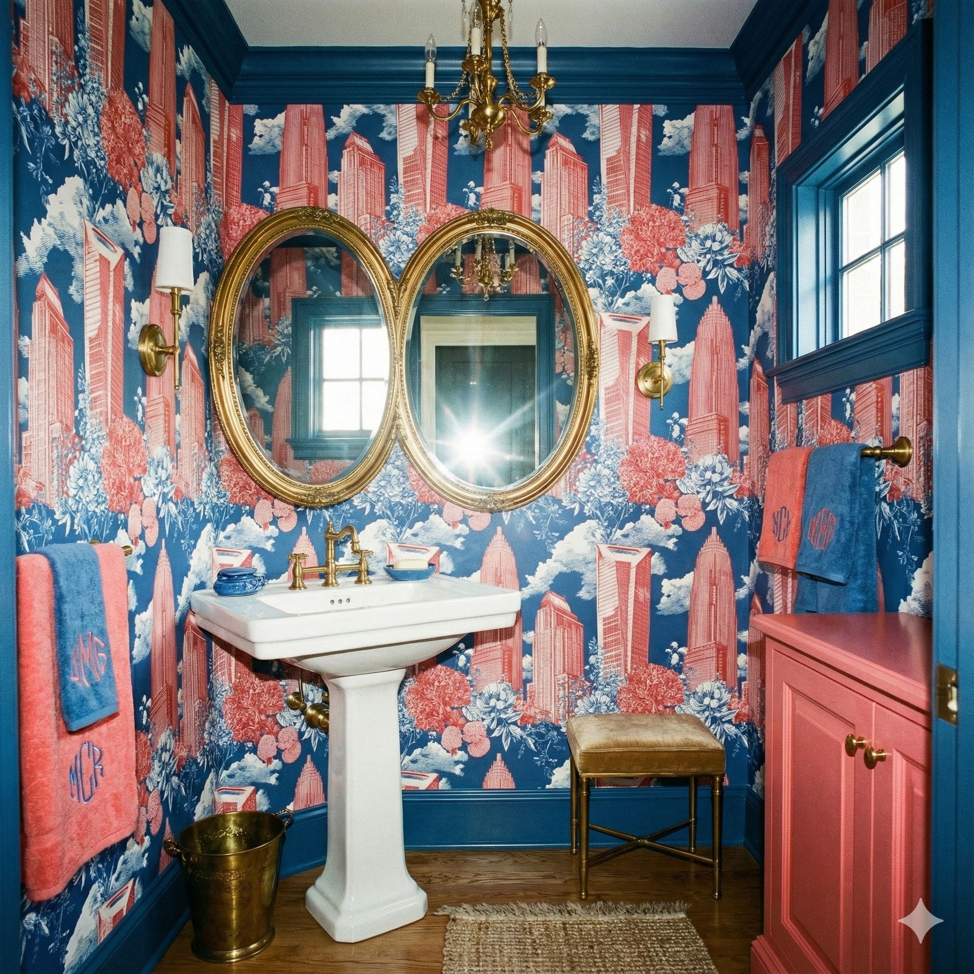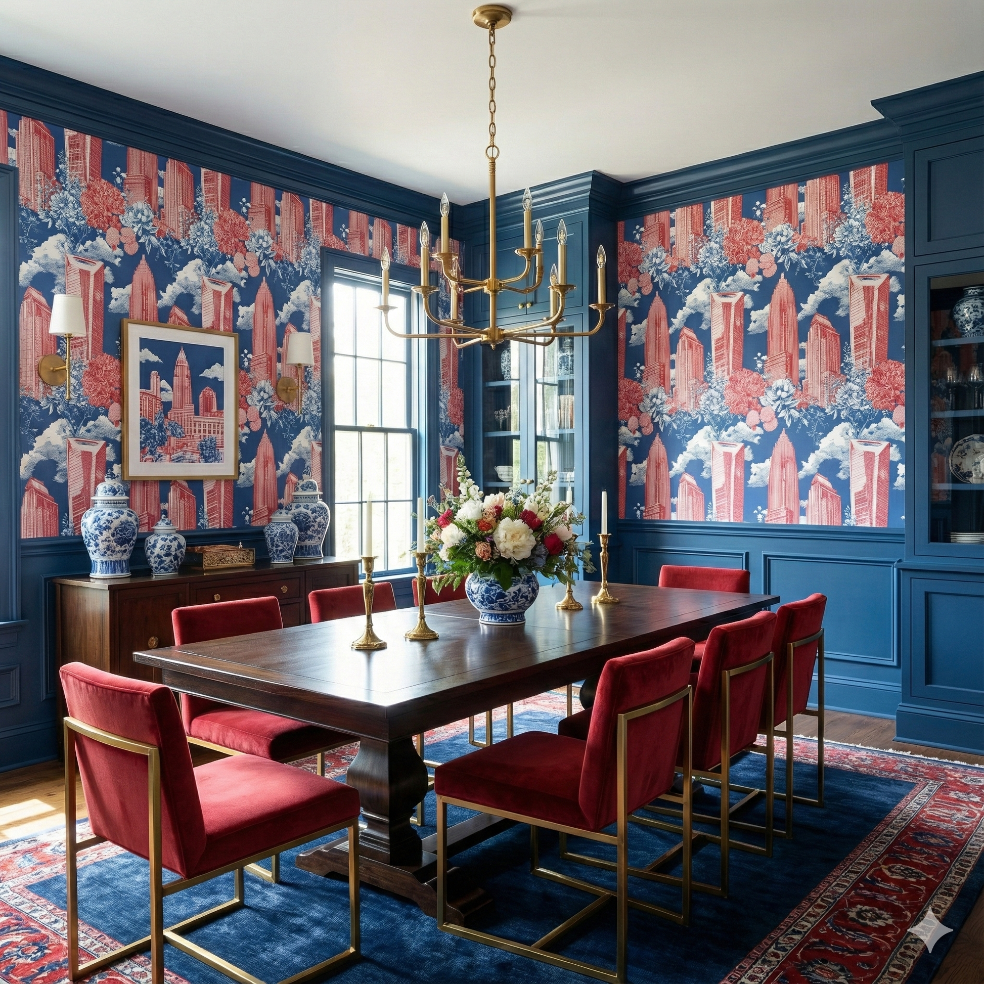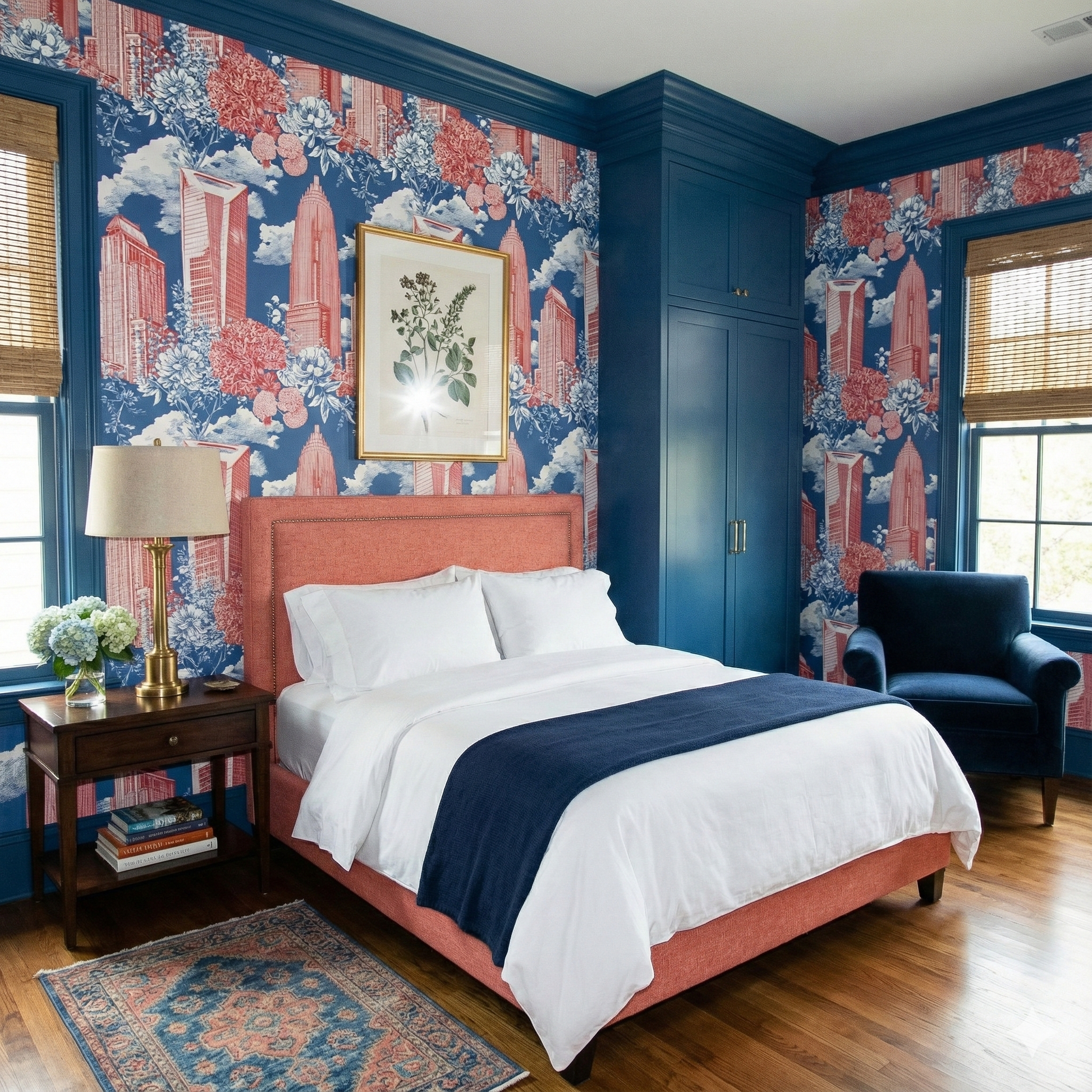 A lively fusion of Charlotte’s iconic skyscrapers with oversized blooming botanicals illustrated in romantic linework and washed in a soft palette of rosy corals and sky blues. The interplay of structured urban geometry and lush florals creates an artistic duality—polished yet playful, metropolitan yet garden-forward. This wallpaper shines in boutique retail spaces, powder rooms, feminine home offices, creative studios, and nurseries that want something sophisticated but imaginative. It’s a highly decorative pattern that photographs exceptionally well and offers a fresh reinterpretation of city-meets-nature design.