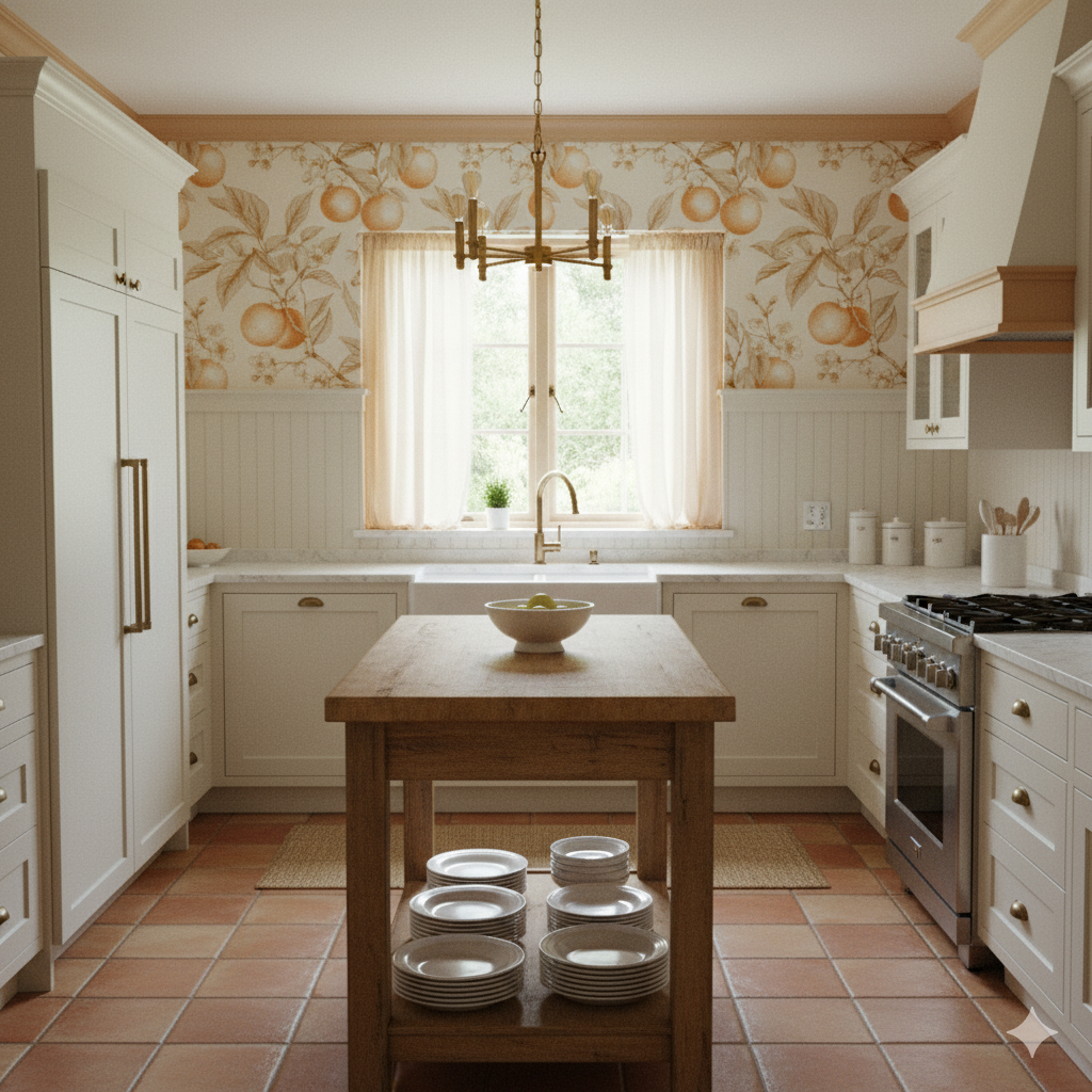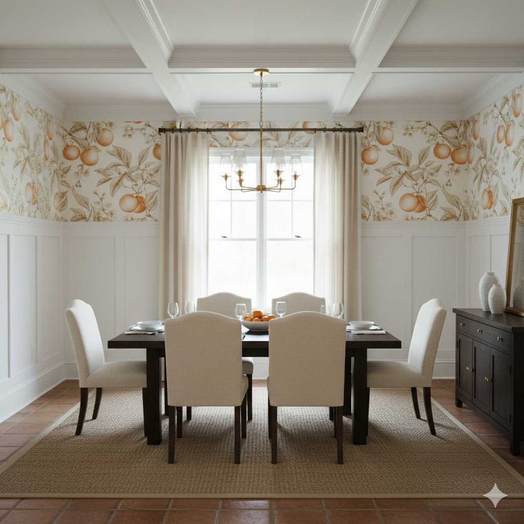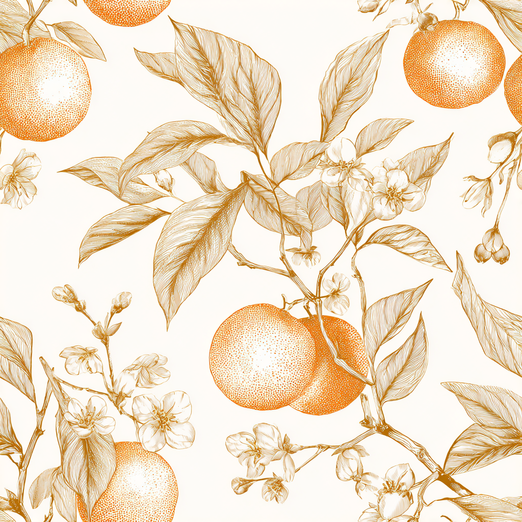 Vibrant yet refined, Valencia Grove celebrates the golden radiance of citrus trees in bloom. Rich orange fruits and pale blossoms intertwine with precise, engraved leaves on a warm ivory ground. The composition feels both botanical and ornamental—perfect for Mediterranean kitchens, dining areas, or boutique hospitality spaces. Its fine-line artistry nods to vintage fruit crate labels and traditional engravings while maintaining a crisp, contemporary sensibility.