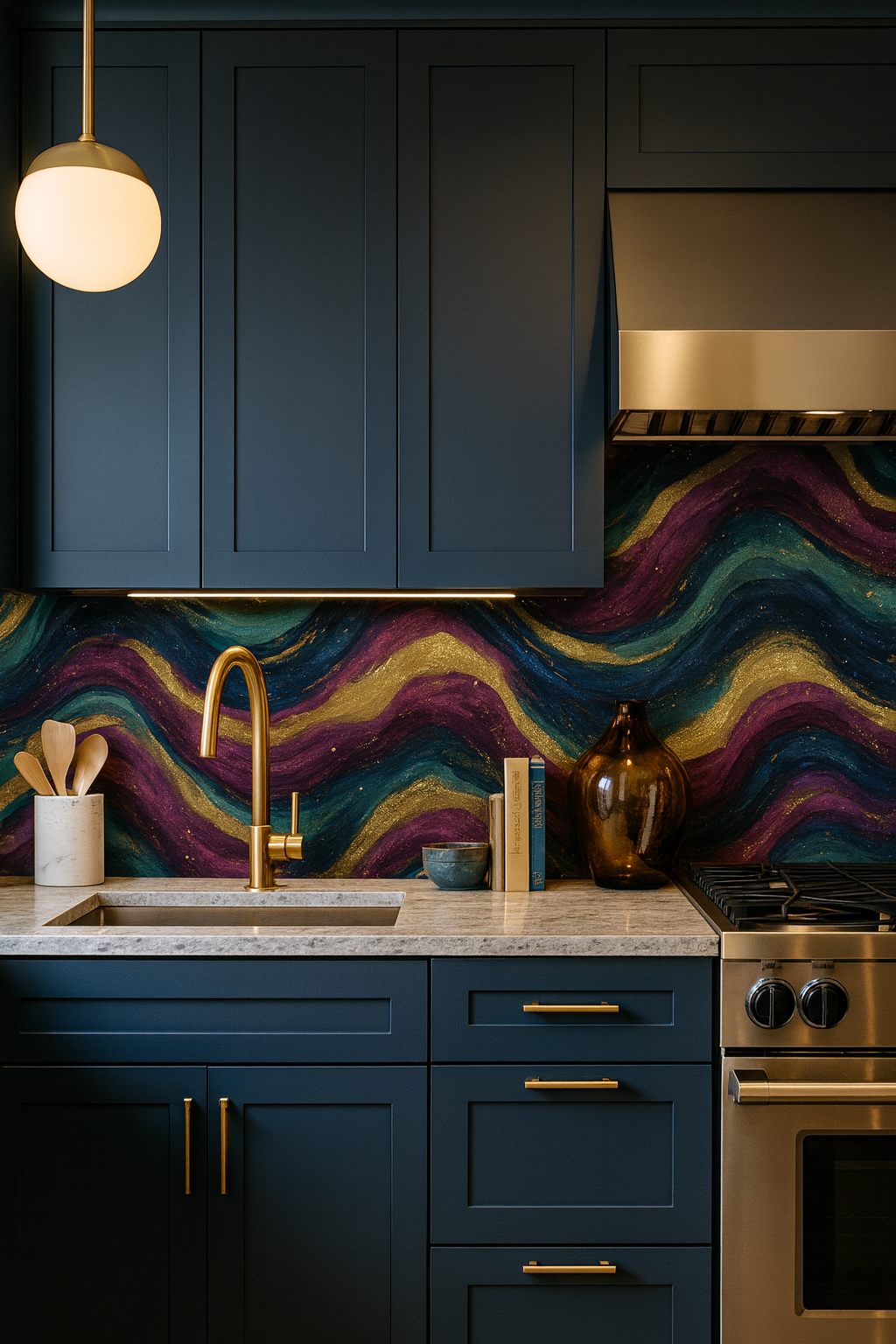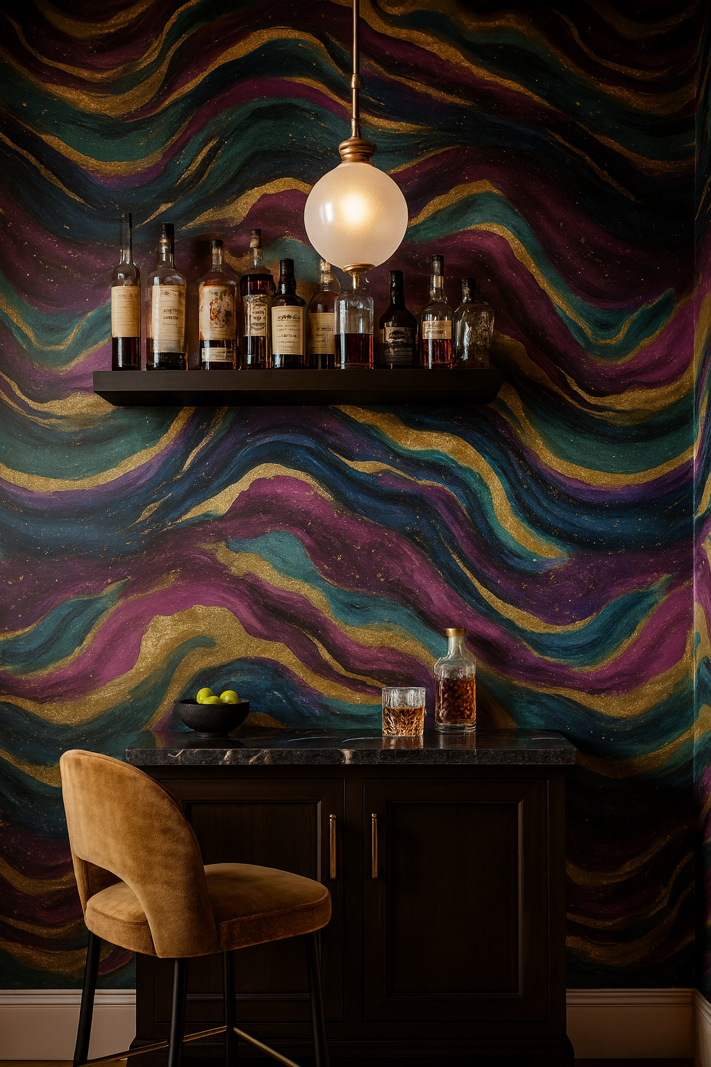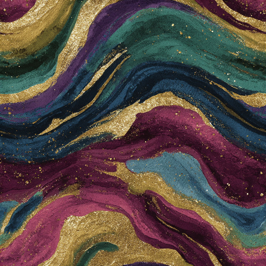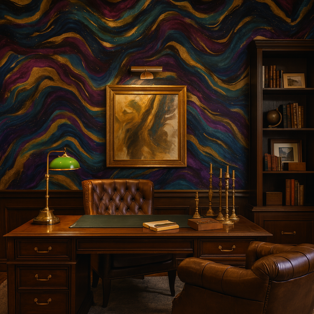 Swirling waves of plum, emerald, teal, and midnight navy flow across the surface, streaked with veins of shimmering gold that mimic marble but with a painterly exuberance. The pattern glitters with opulence, yet its fluidity adds softness and motion. Velour Eclipse is bold, decadent, and theatrical — ideal for powder rooms, lounge walls, or hospitality spaces aiming for a high-impact, glamorous atmosphere. Paired with jewel-toned velvets and moody lighting, it becomes the centerpiece of a room, elevating it into a stage-like setting.