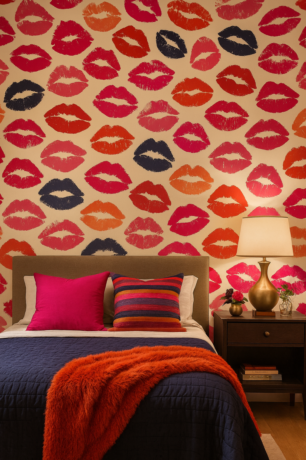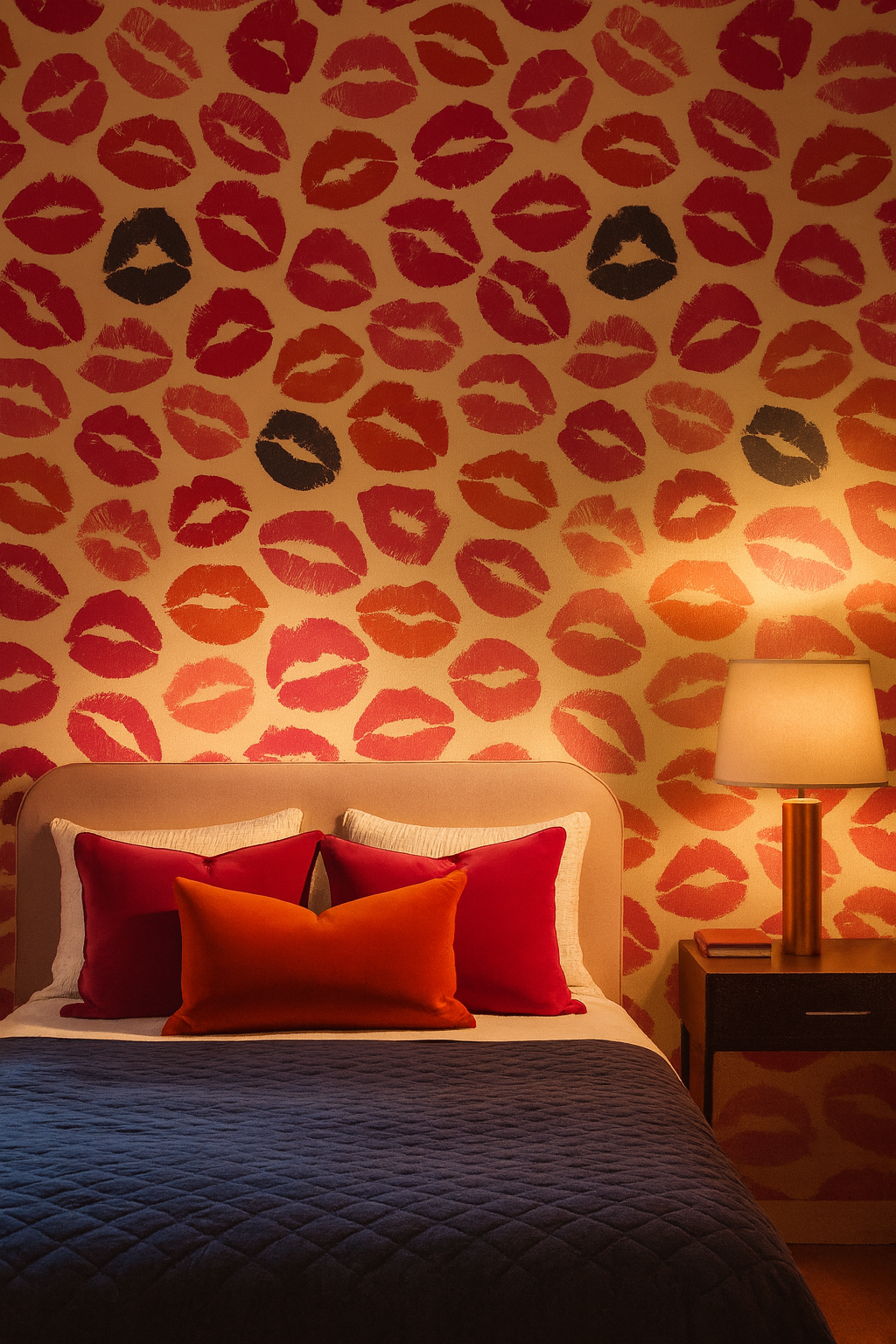 This bold, playful design captures the essence of romance and rebellion in one striking pattern. Stamped lipstick marks in vibrant shades of crimson red, fuchsia pink, coral, and deep navy scatter across a creamy background, creating a pop-art inspired effect. The imperfect texture of each kiss adds character, like brushstrokes of affection, giving the wall both intimacy and energy. Perfect for a modern boudoir, a statement powder room, or even a chic bar or boutique space, Velvet Kiss balances cheekiness with glamour. It pairs beautifully with metallic accents, black lacquered furniture, or even minimalist white interiors that need a burst of unapologetic personality.