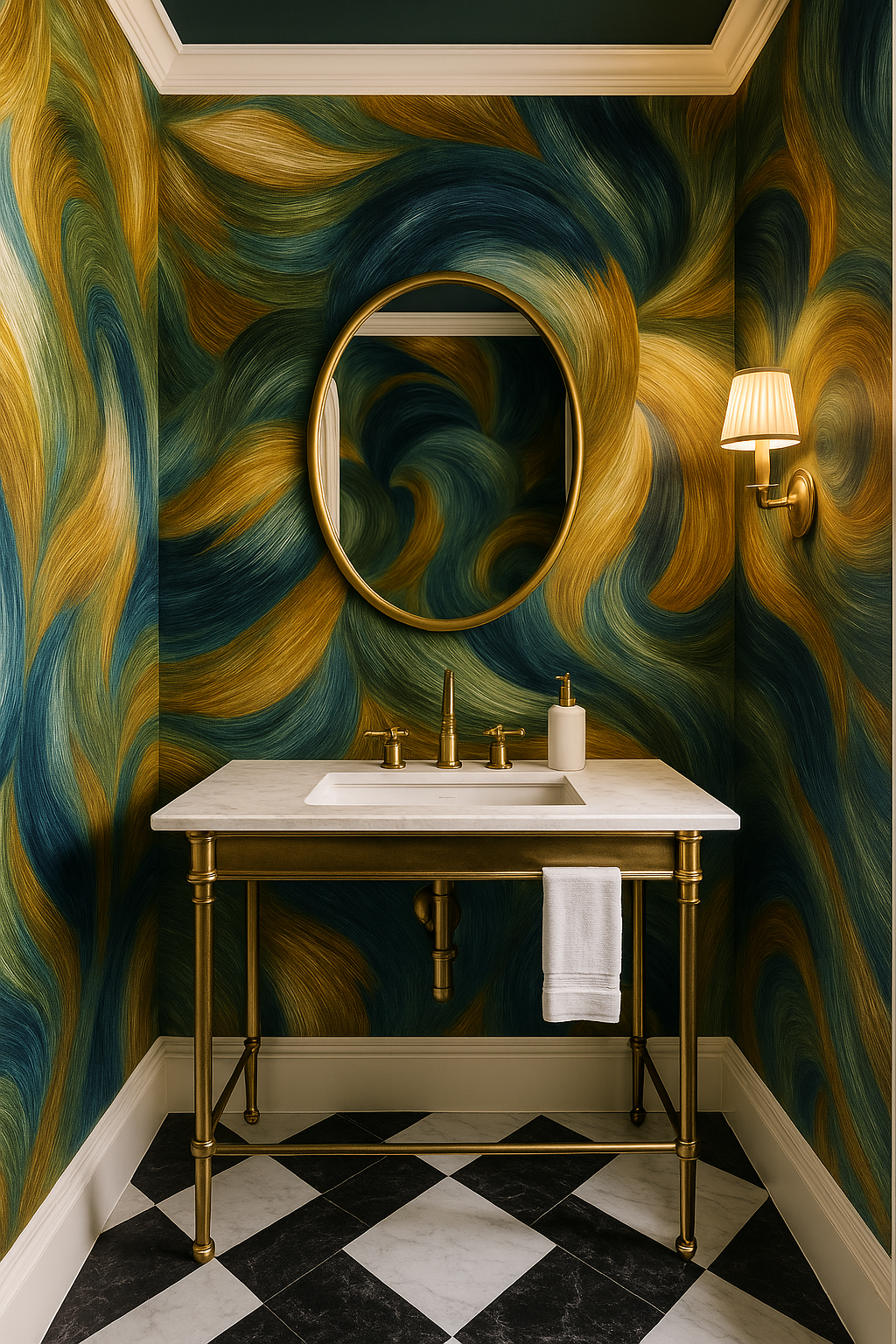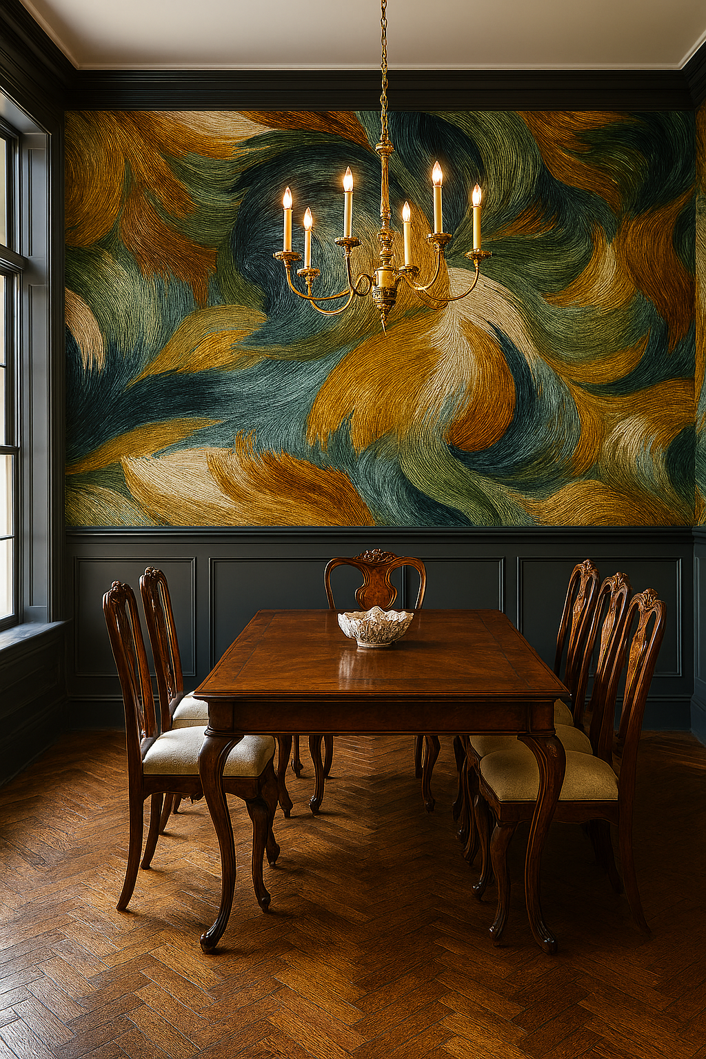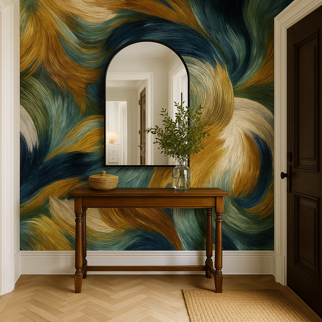 Rich and hypnotic, Velvet Swell layers fluid waves of deep emerald, golden ochre, and peacock blue in a tactile swirl that feels almost touchable. Inspired by painted feathers and wind-swept hair, this wallpaper adds bold movement and painterly texture to any space craving warmth and drama. Use it in dining rooms, creative lounges, or high-concept hospitality spaces where art meets interior.