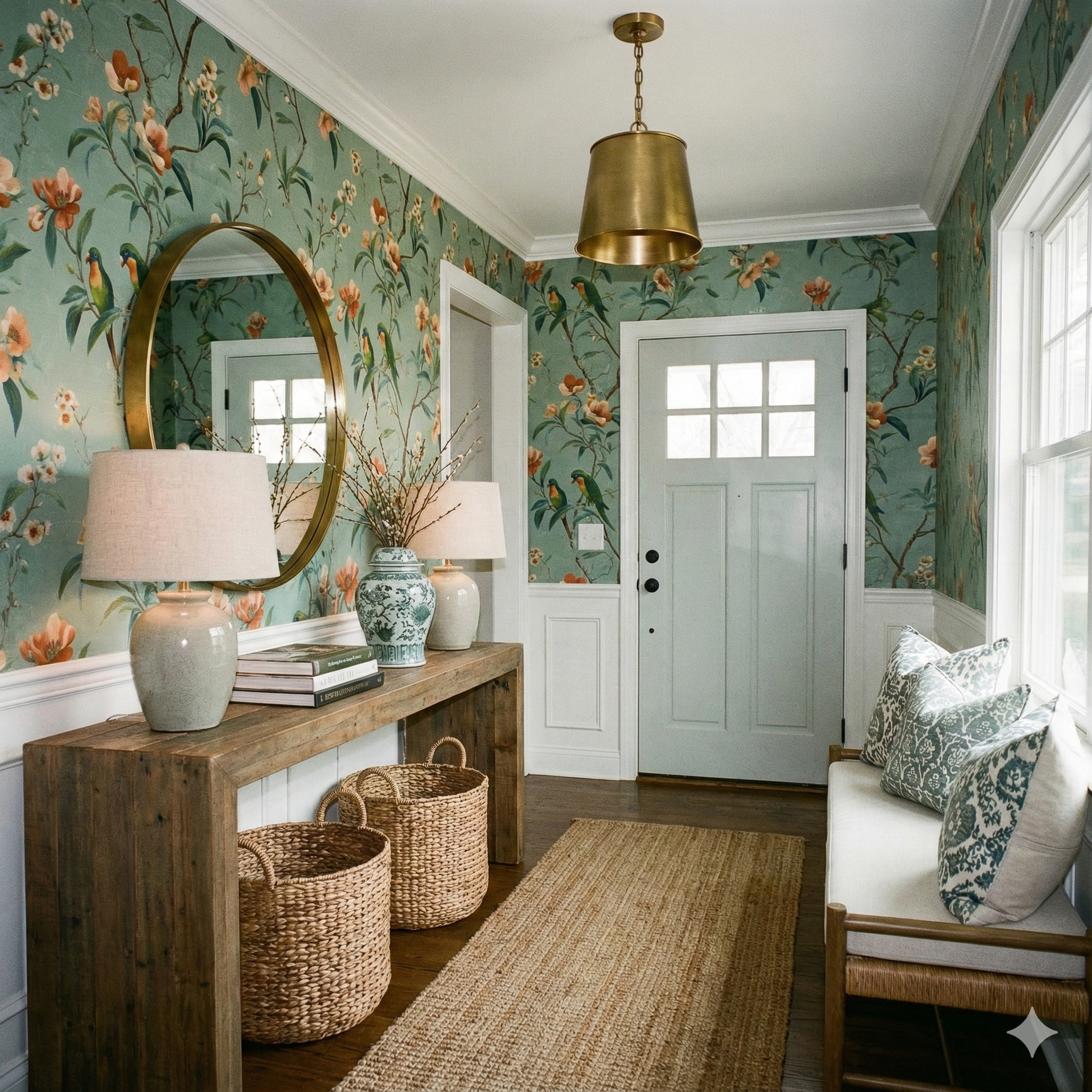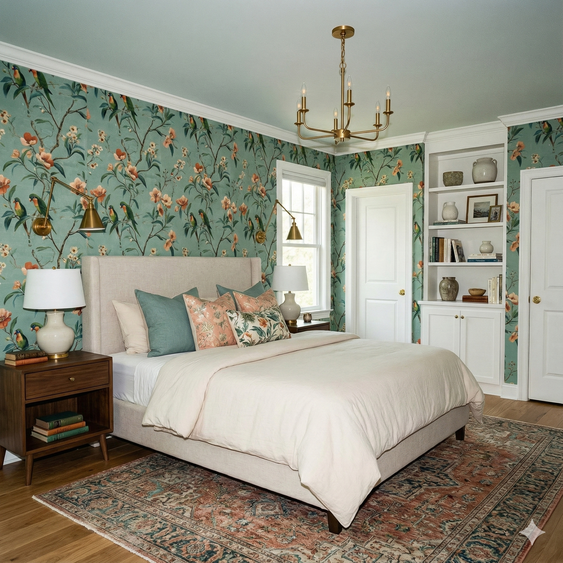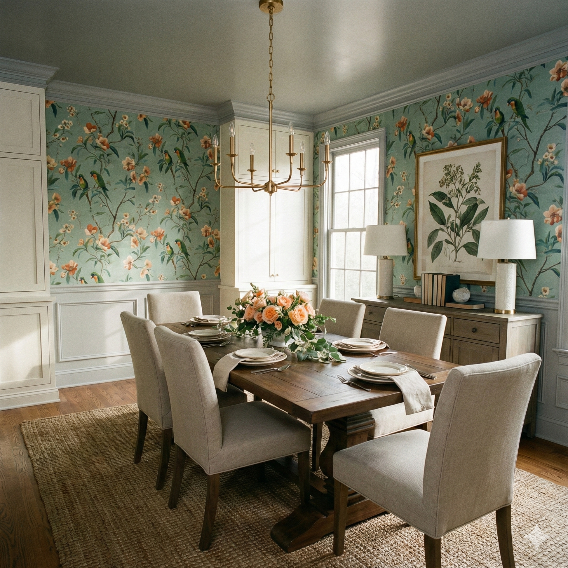 A muted mint ground sets the stage for a lush botanical tableau inspired by painterly chinoiserie. Vivid green parrots with warm orange throats perch among peach, coral, and apricot blossoms, each crafted with delicate directional brushstrokes that create texture against the subtly mottled background. Branches twist organically across the repeat, recalling hand-painted silk panels, while the color palette blends freshness with sophistication. The design feels joyful yet refined, making it a standout choice for sunrooms, kitchens, garden-inspired dining rooms, eclectic living rooms, or boutique cafés that want to project color without chaos. The mint backdrop keeps the mood calming, while the birds and blossoms provide vibrant focal interest that reads timeless rather than trendy.