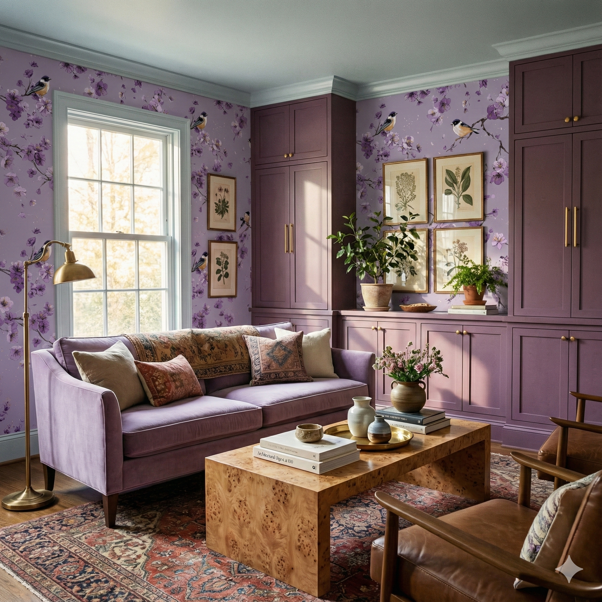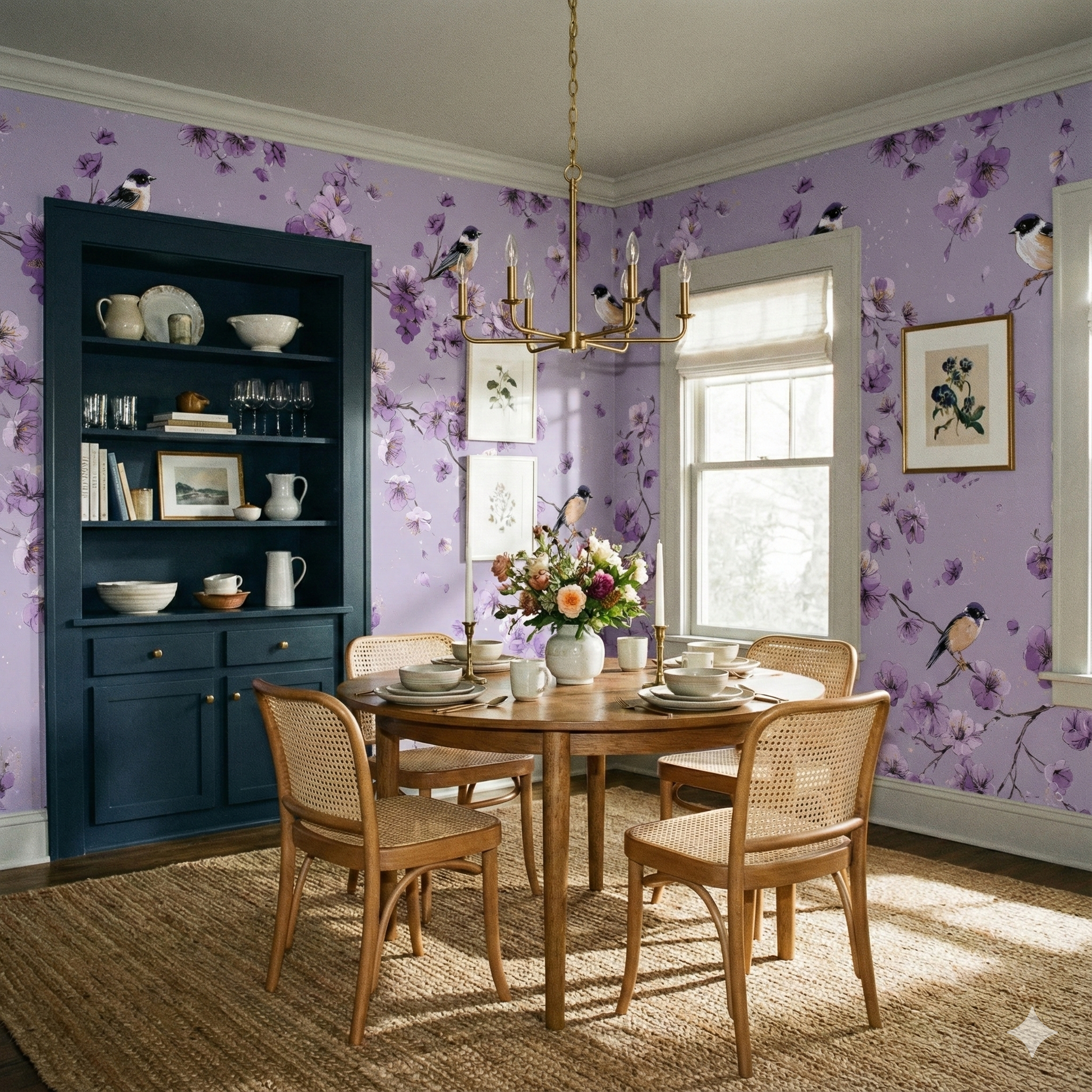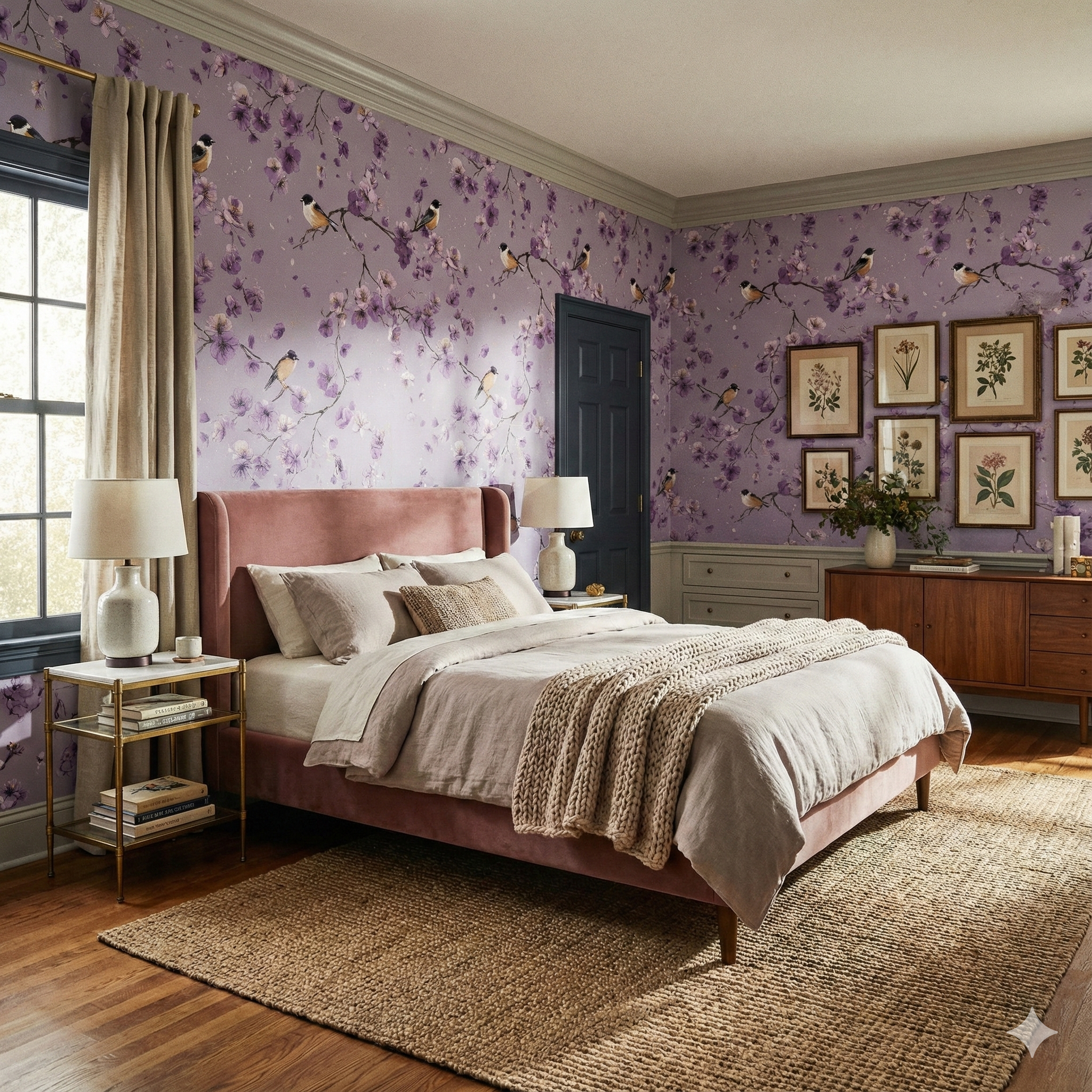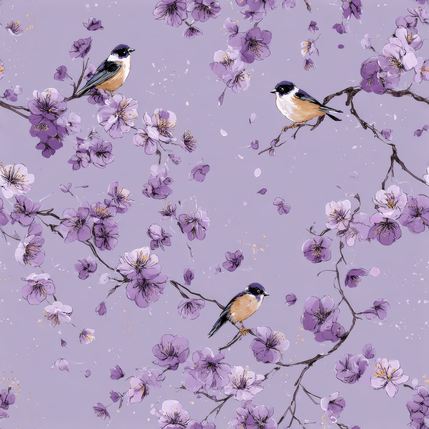 Soft lavender forms the backdrop for a cascade of plum blossoms painted in expressive strokes ranging from pale lilac to deep mulberry. Small warm-toned songbirds perch along the slender branches, breaking up the florals and adding life to the repeat. Gentle speckles of white and brushed gold flicker across the background, giving the impression of petals and light drifting through air. The mood is poetic, whimsical, and slightly ethereal — perfect for bedrooms, creative workspaces, boutique dressing rooms, or a child’s room with a more elevated palette. This design works beautifully with warm neutrals, brushed brass, ivory furniture, and soft gray upholstery. Its delicate movement allows it to feel airy and colorful at the same time.