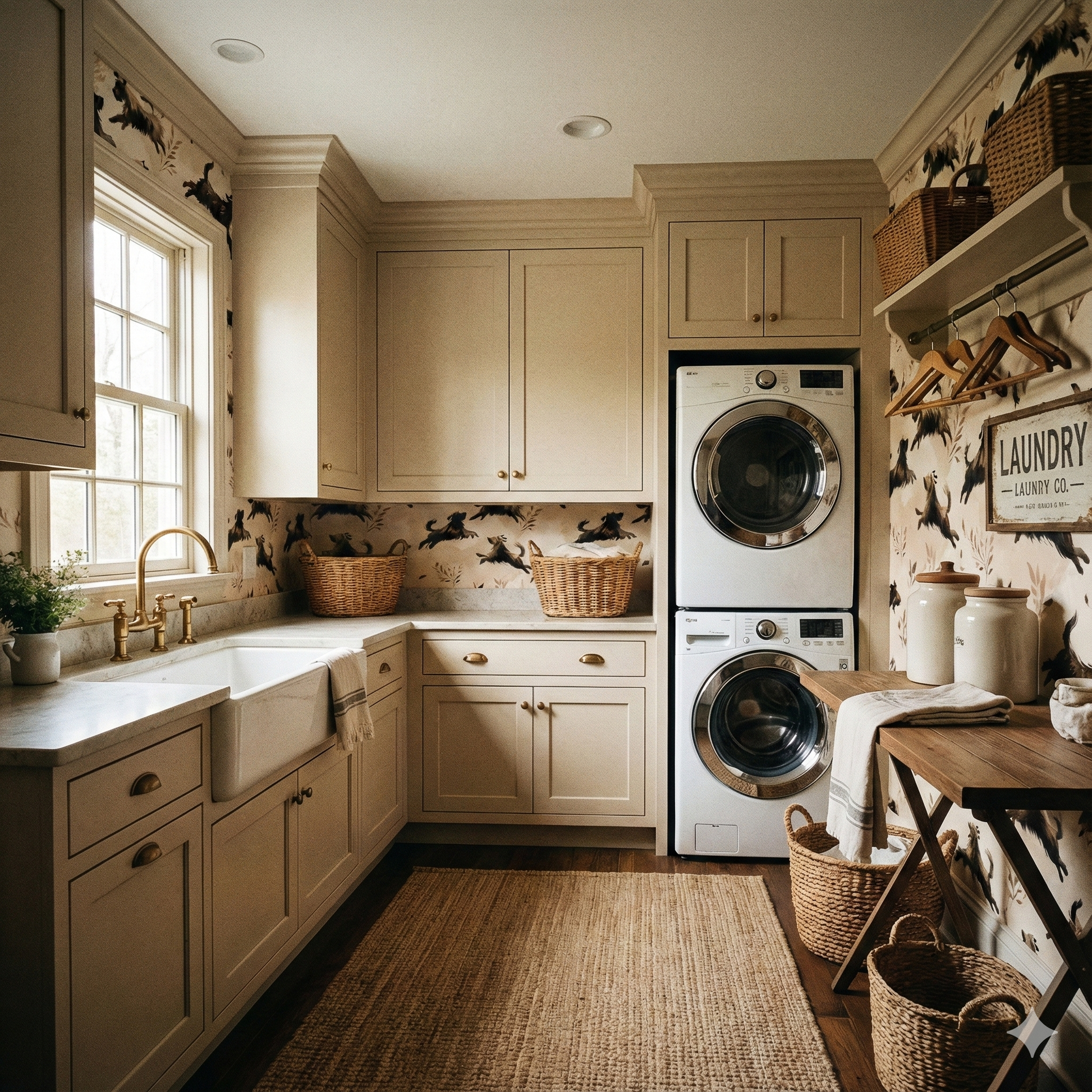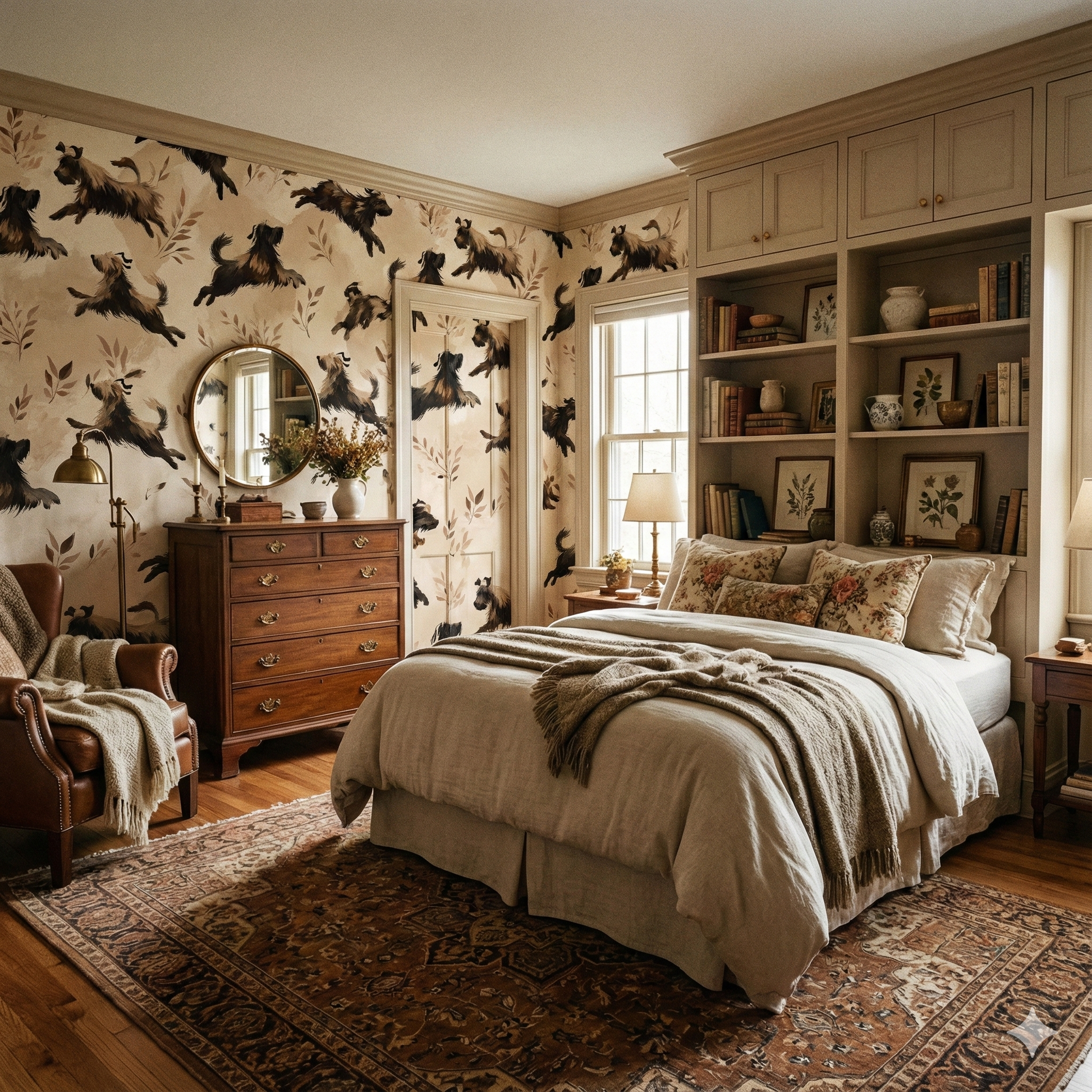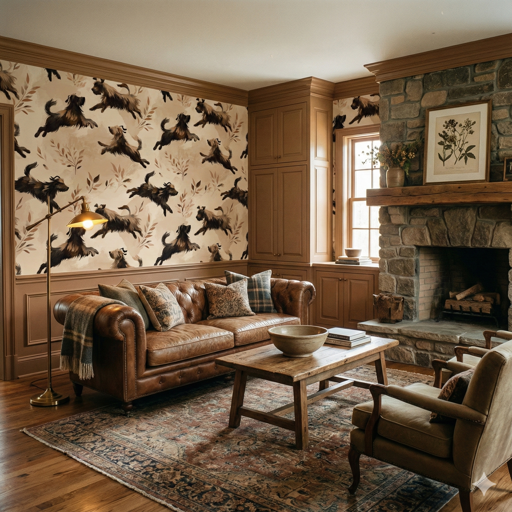 A celebration of joyful motion and tousled fur, this lively terrier pattern captures dogs mid-leap across a neutral tan background softened with watercolor foliage. Shades of chocolate and chestnut create a sense of autumnal warmth, while the loose painterly strokes keep it feeling spontaneous and energetic. Ideal for mudrooms, children’s spaces, or country kitchens, it balances charm with sophistication — the kind of pattern that feels alive, but still classic. There’s playfulness here, but never kitsch.