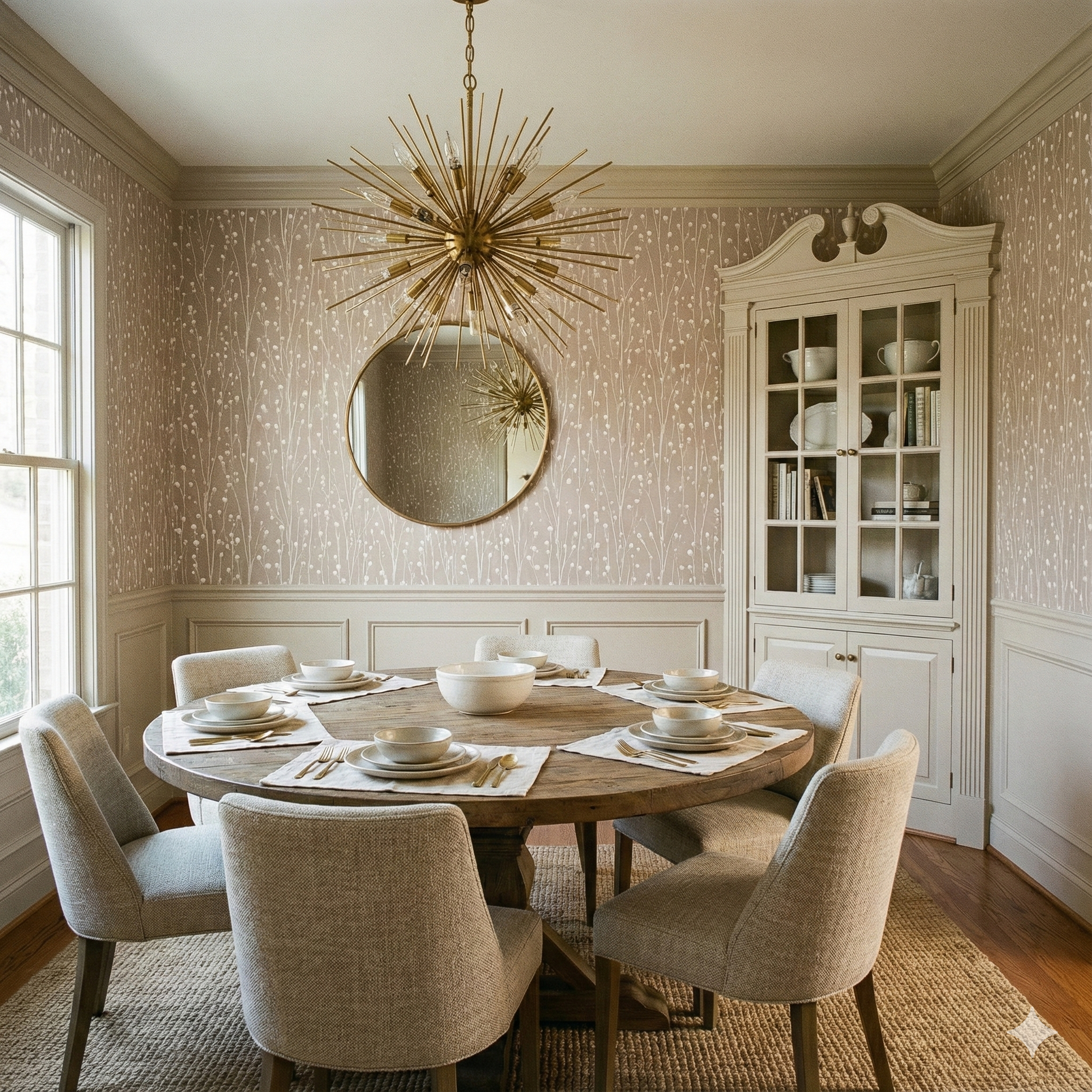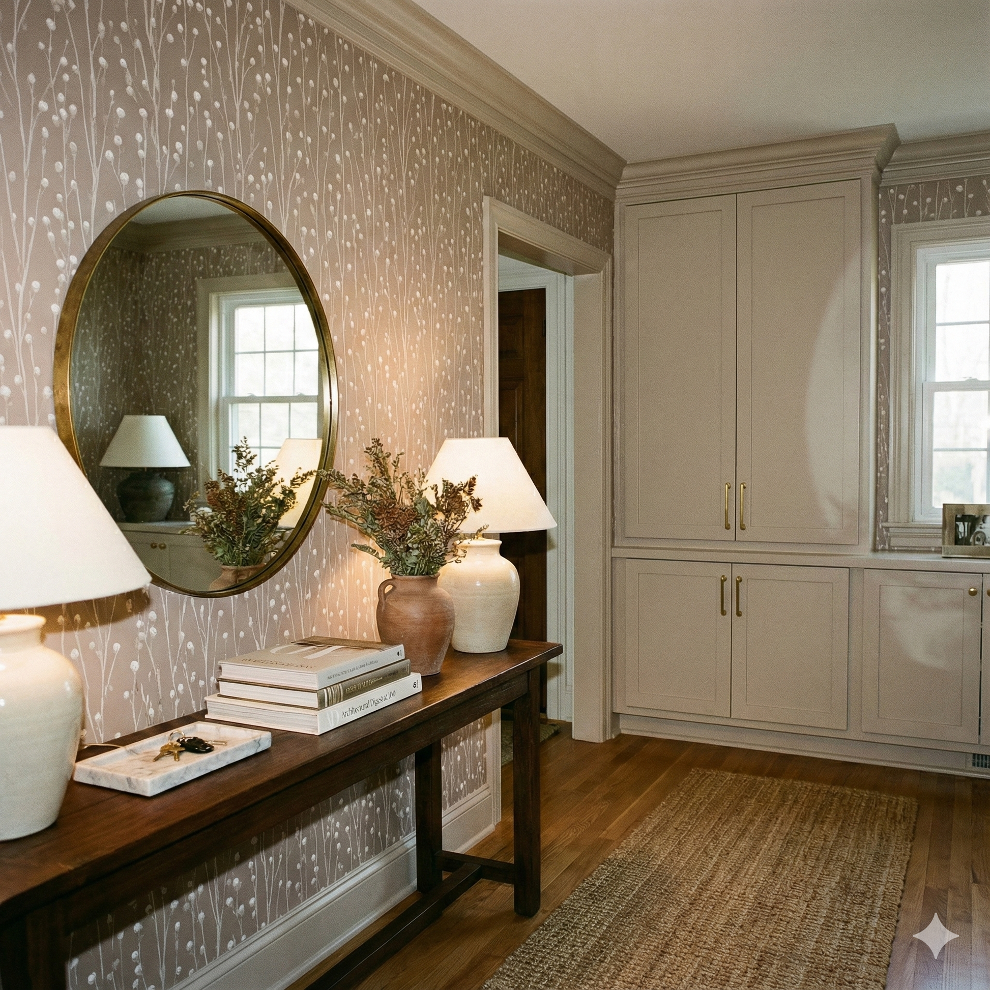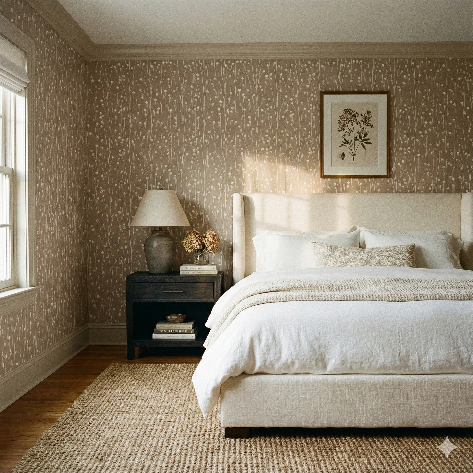Willowdusk Sprigs is a gentle vertical meadow of thin stems topped with rounded buds, repeated evenly to create a calming natural rhythm. The brushwork is soft, almost watercolor-like, with each bud rendered in pale cream tones against a warm taupe background. The effect is understated yet enchanting—like dried botanicals arranged in soft light. This design works beautifully in nurseries, hallways, Scandinavian living rooms, transitional kitchens, and cozy bedrooms where organic subtlety is more desirable than bold florals. Willowdusk Sprigs pairs effortlessly with woven textures, soft fabrics, natural wood tones, and matte ceramics, giving any space a clean, tranquil, and airy presence.