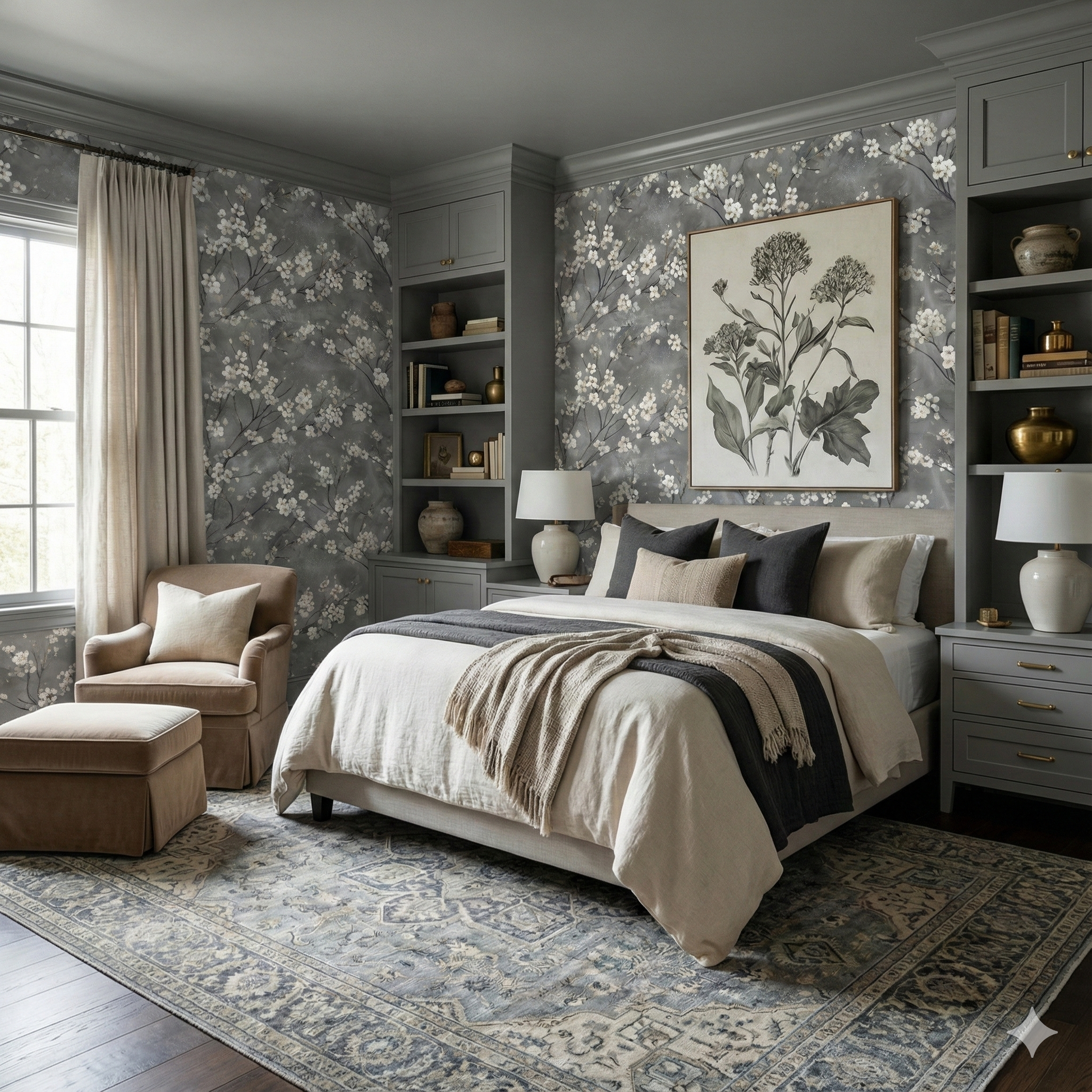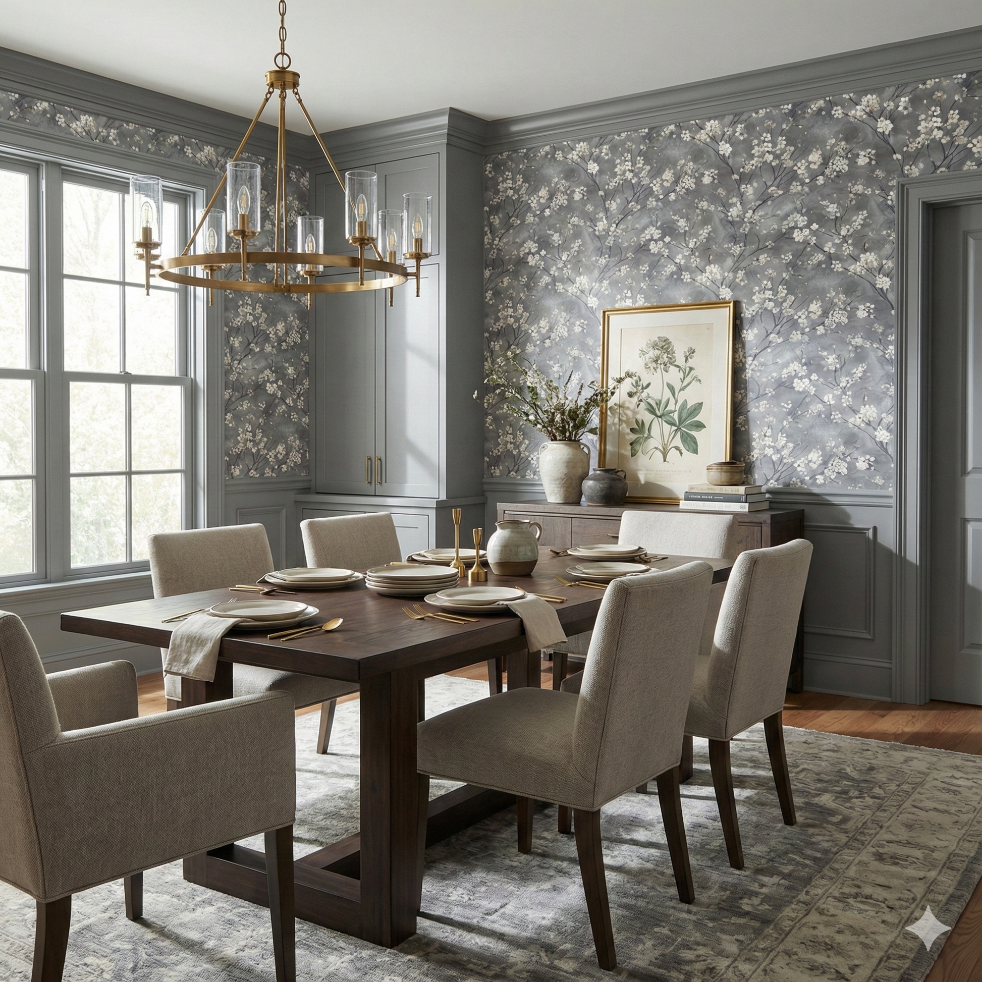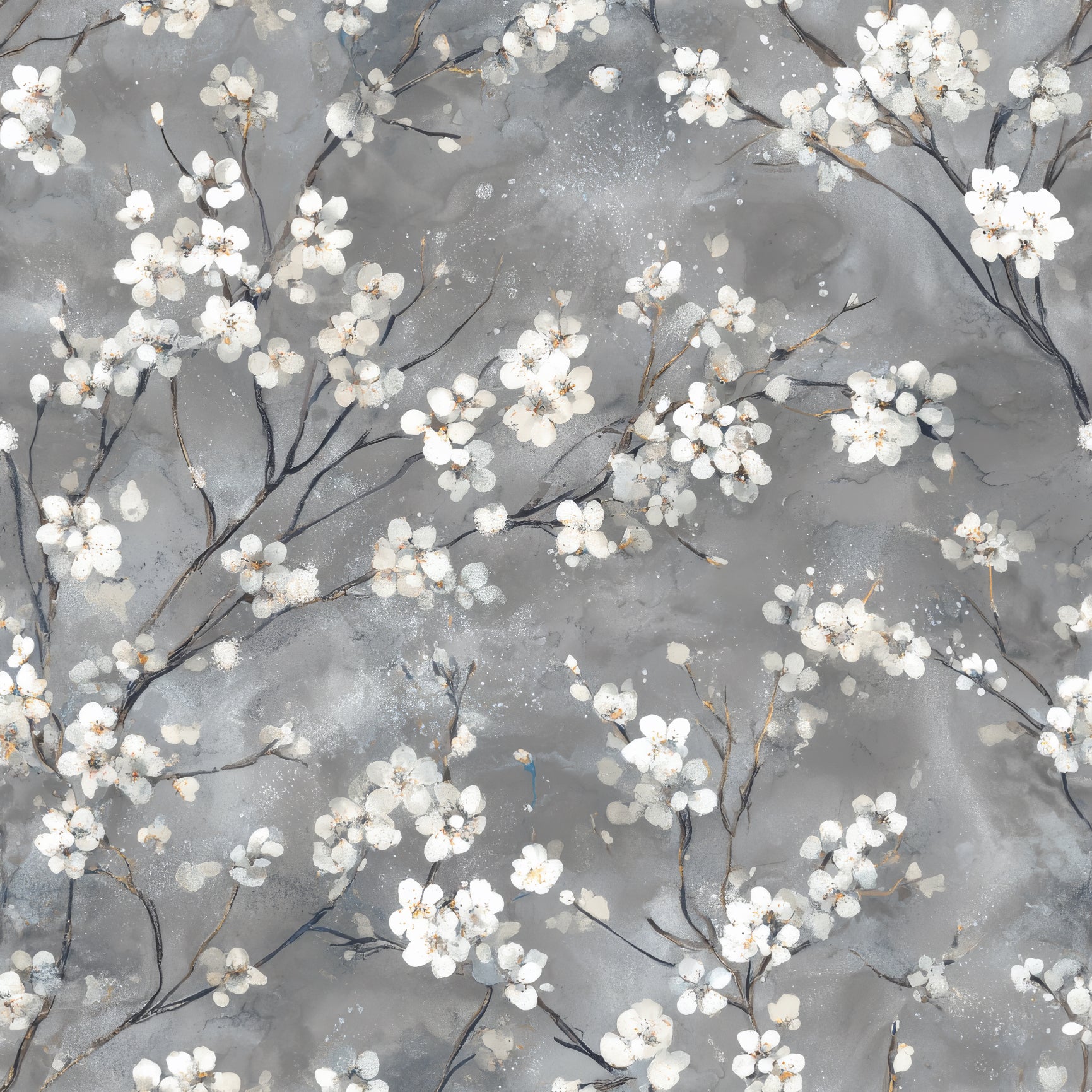 A cool slate-gray wash forms the atmospheric backdrop for layers of floating blossoms, each one dusted with delicate white petals and subtle golden and charcoal accents. The composition has a painterly softness, as though watercolor clouds and drifting petals merge into one continuous motion. This pattern offers a sense of gentle snowfall, making it perfect for spaces that benefit from a serene, dreamlike quality: bedrooms, reading corners, spa rooms, or sophisticated dining rooms. The interplay of soft blur and crisp branchwork creates visual depth without overwhelming a wall. It reads both contemporary and classic, ideal for homeowners searching for something that feels calming, ethereal, and timeless without leaning too feminine or too minimalistic.