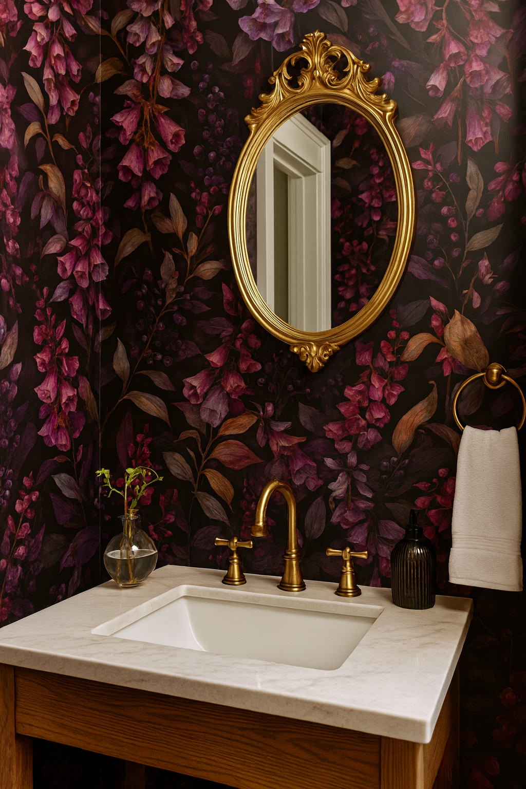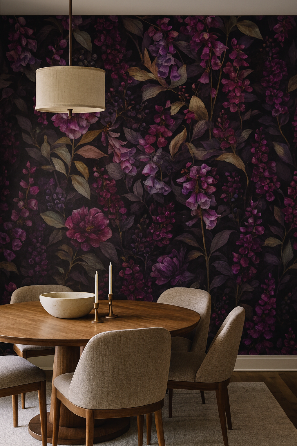 Clusters of foxglove, nightshade, and berries intertwine in a dark, moody floral landscape. Rich magentas, indigos, and shadowy olives create an atmosphere that's part Victorian herbarium, part enchanted forest. An excellent pattern for storytelling interiors or fashion.