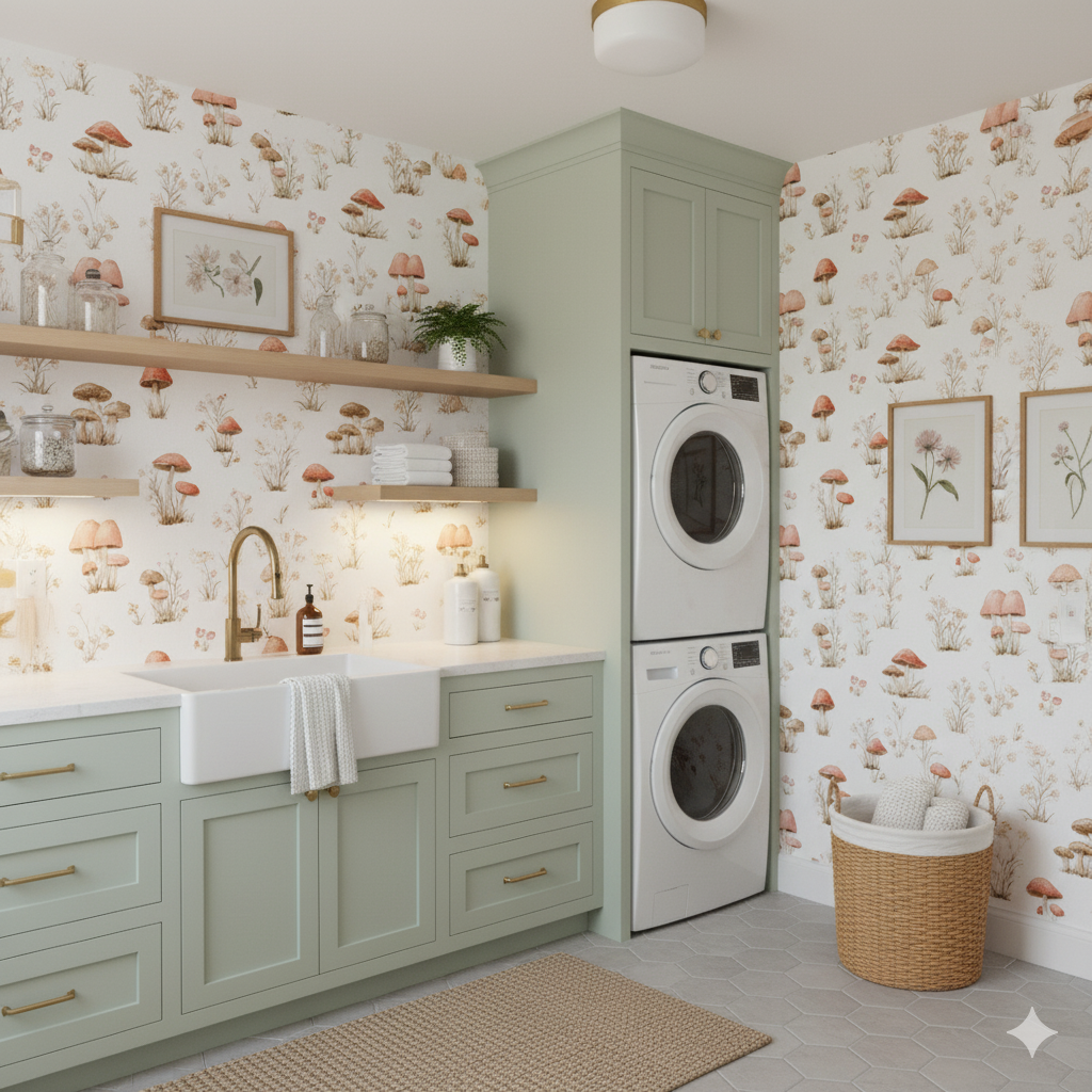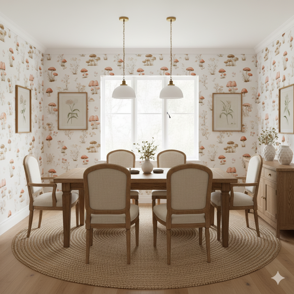 Clusters of watercolor mushrooms — from rusty red fly agarics to soft brown chanterelles — sit among delicate wildflowers and grasses, scattered naturally across a cream background. The hand-rendered detail feels whimsical yet organic, making it ideal for children’s bedrooms, woodland-themed nurseries, or cozy cabins. This design celebrates forest magic, creating a fairytale atmosphere while remaining grounded in soft, neutral earthy tones. Perfect for spaces that want to embrace a cottagecore or enchanted woodland theme.